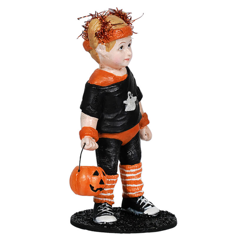 Let's get Physical, Physical!!! (Come on you know you want to sing the Olivia Newton John song, "Physical"!) Little Halloween Work Out Babe, might not be Olivia Newton John, but she sure is dressed the part and ready to do a workout!! This hand painted resin figure is the perfect addition to you Halloween decorations with an aerobic twist! She's dressed for success and to impress in her black and orange workout gear, complete with fashionable orange sweatbands around her wrists and head, for an even more 1970's nostalgic look. Plus, how cute is that orange pumpkin bucket she’s carrying! With the Halloween Work Out Babe, you can get into the spooky spirit while still being mindful of your fitness goals! Burn off all those candy calories while making sure your decorations are festive and inviting. Group her with Bethany Lowe's other Halloween children figures to create an adorable display of children trick or treating in their fun little costumes!