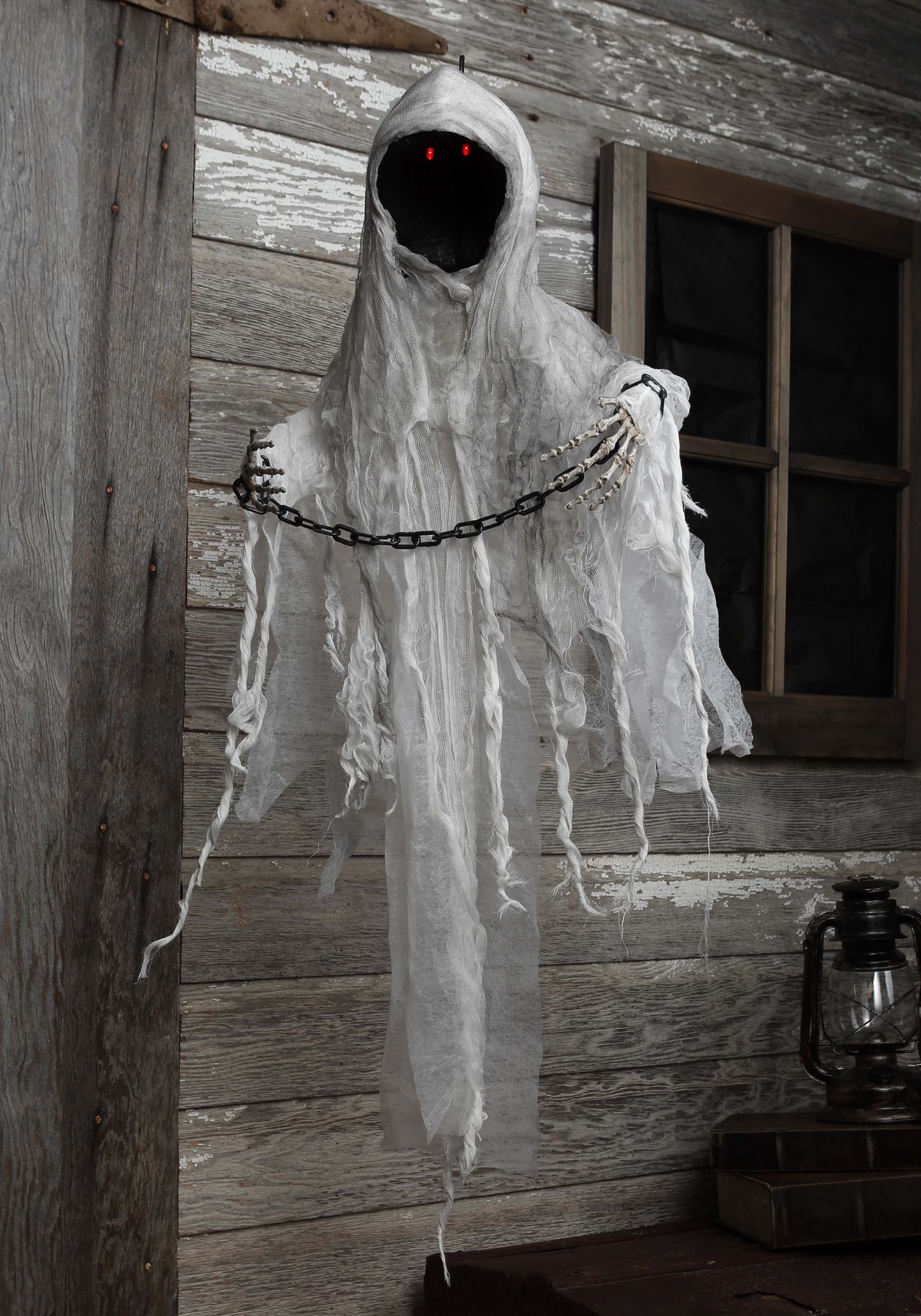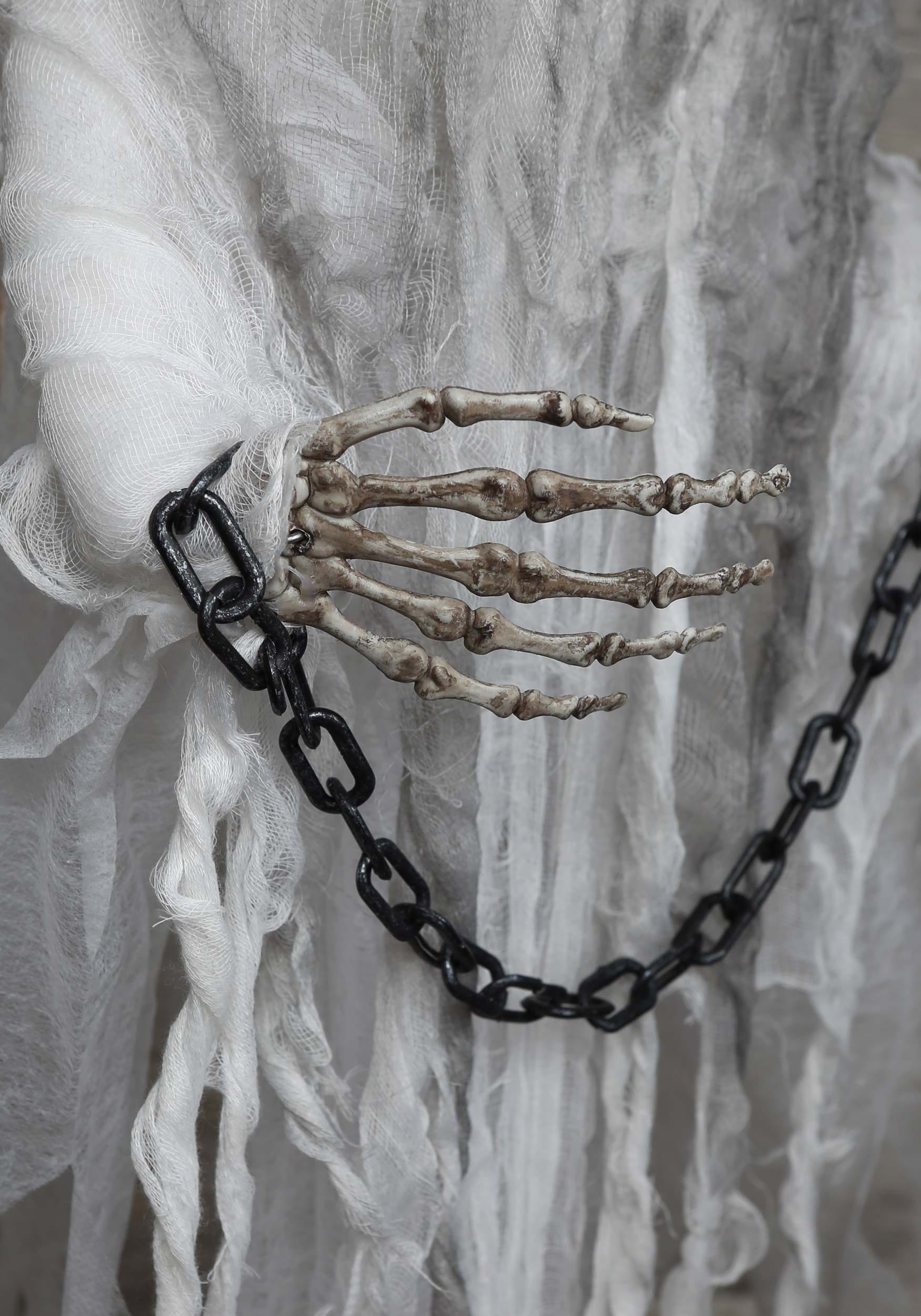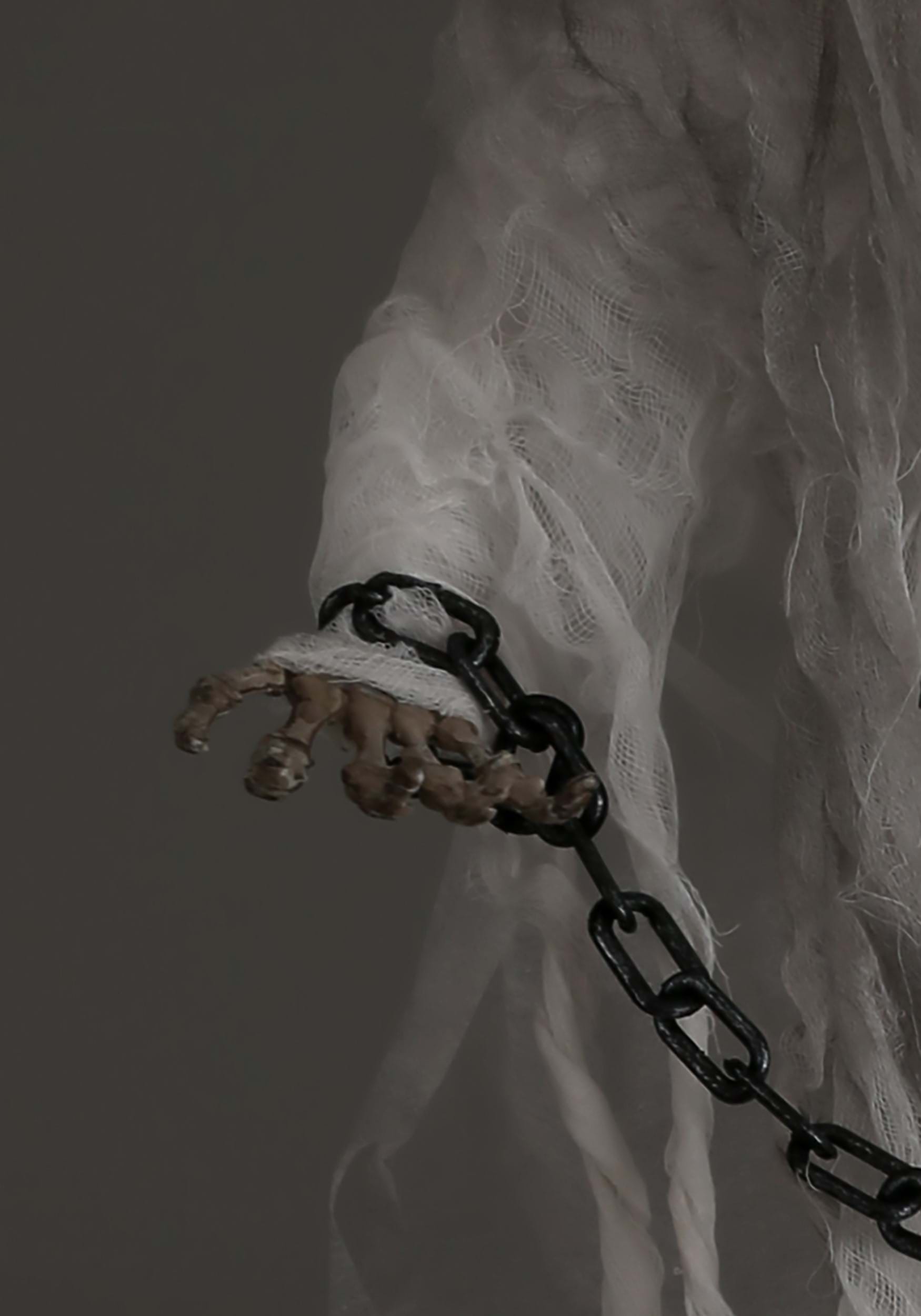 This ghostly figure features a plastic head and chest, draped in tattered and stained gauze fabric. Its arms, made of foam-covered wire, are equipped with molded plastic skeletal hands that can be posed in any way you desire. Shackled by a plastic chain, this ghostly prisoner is ready to haunt your space.