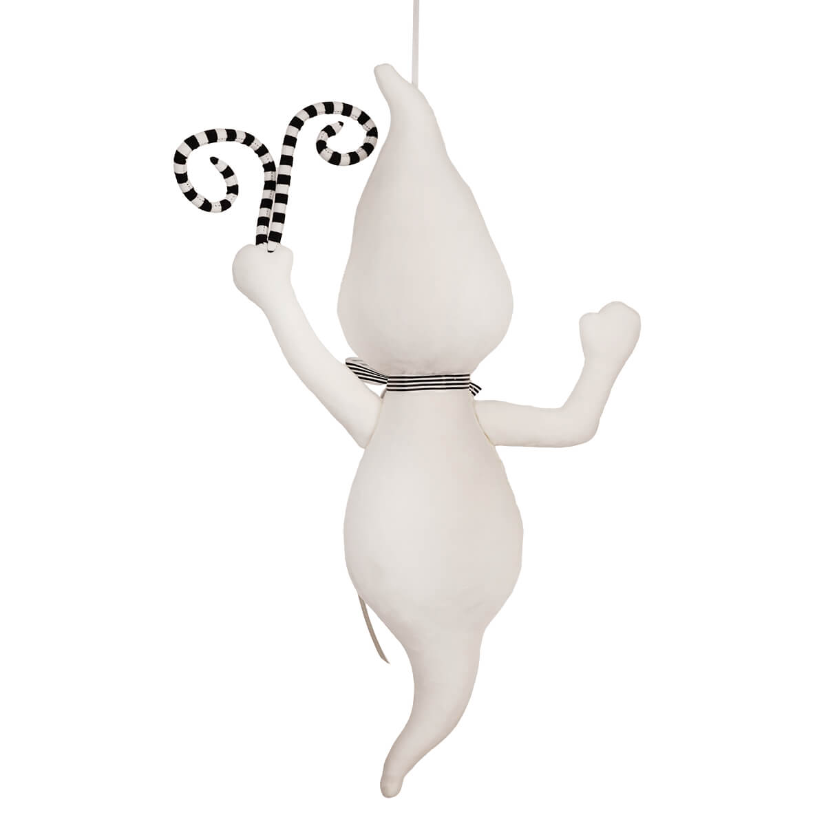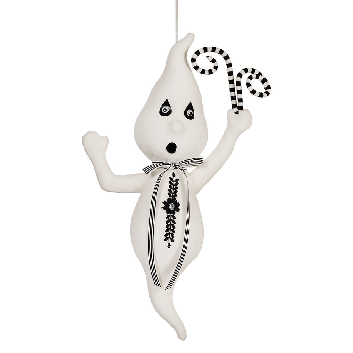 Held in one hand are black and white swirled sticks, adding a whimsical touch to his ghostly demeanor. The black and white ribbon tied around his neck, with a black epaulet down the front of his ghost body, completes his charming ensemble.