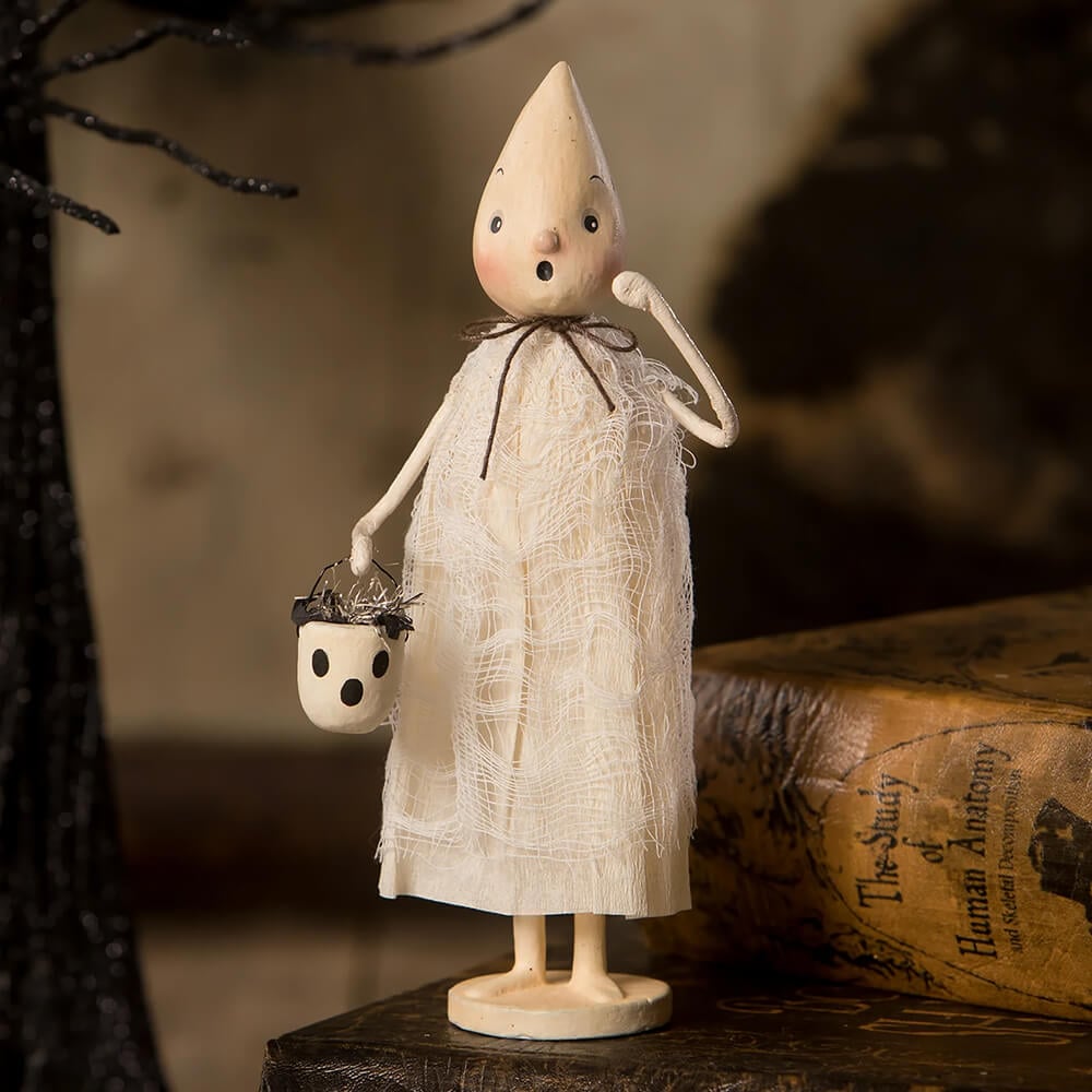 Happy Haunting Ghost is the ultimate Halloween staple that every spook-tacular decorator needs! This terror-tastic design from Michelle Lauritsen for Bethany Lowe, is definitely going to give your guests a good fright or at least make you smile! With a white, translucent body and a haunting stare, this little guy is sure to be the centerpiece of your next eerie gathering. Place him wherever you want to set the mood for maximum spook – he's ready to scare the yelps out of everyone! He's sure to leave your guests with an unforgettable ghostly experience they won't soon forget. Make sure you get your hands on Happy Haunting Ghost before it's too late - don't let this spine-tingling spirit haunt you in regret later!