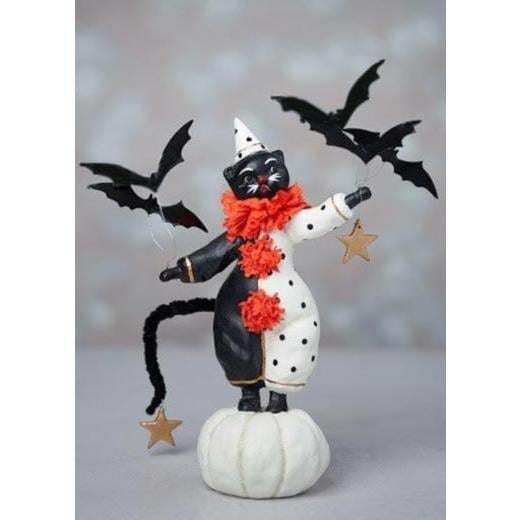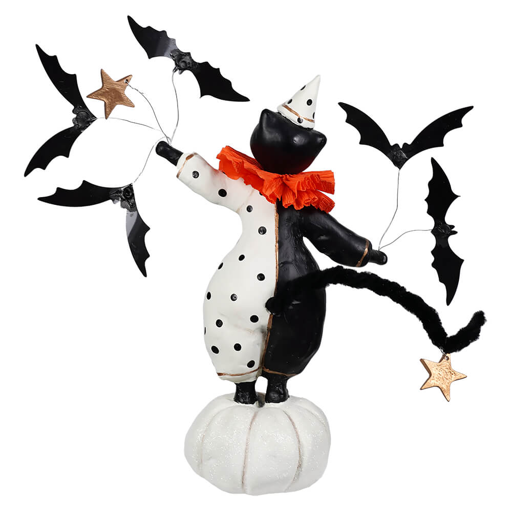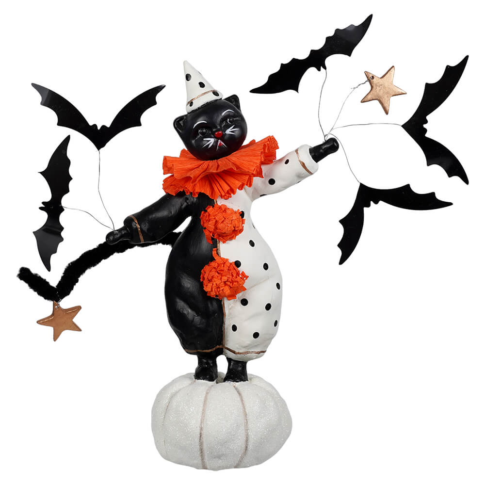 Hocus is adorned in a black and white clown outfit adorned with vibrant orange crepe paper accents, this magical cat casts a spell of frightful fun. With bats shooting from its fingertips, like doves might from a typical magician, Hocus embodies the perfect blend of Halloween festivities and a showman’s charisma.
