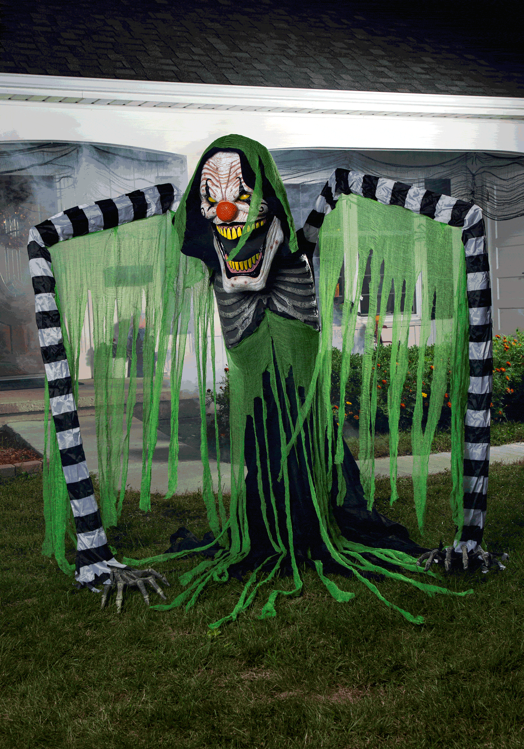 Standing at a towering 6 feet tall, with dimensions of 7'L and 6'W, this menacing figure will send shivers down your spine. Activate the prop using the infrared sensor, pressure pad, or simply flip the on/off switch, and watch in awe as the figure comes to life. The swaying motion, piercing light-up eyes, and moving mouth will leave you questioning your sanity. And with four bone-chilling phrases, this clown is ready to deliver a frightful performance.