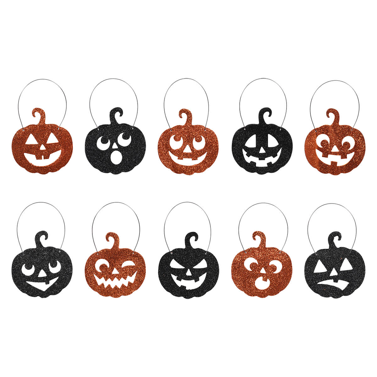 Create décor worthy of the spookiest holiday with this Jack-O-Lantern Glitter Ornaments Set. With the right balance of Halloween fun and glitz, this set is sure to be a hit this season! Bring these lovely little faces into your home and watch as each one adds a unique charm to your display. With ten different designs, each decorated with beautiful orange and black glitter on the front and orange or black paint on the back, you'll be sure to delight in all the creative details that make these pumpkins truly special. Perfectly sized to bring a bit of magic without overwhelming your space, you can use them on a Halloween tree, to decorate a window garland or even string them up to make a garland across a fireplace mantel or doorway! Spread festive fun like never before this Halloween with our Jack-O' Lantern Glitter Ornaments! They’re sure to grab everyone’s attention whether the lights are on or off – the perfect way to make your Halloween magical and memorable!