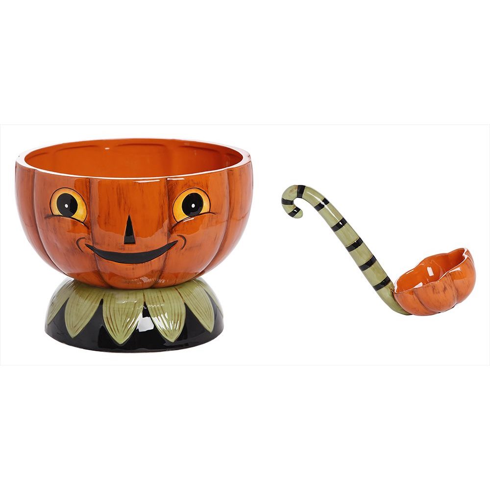 Johanna Parker design. Looking for the perfect punch bowl for your Halloween party? Well, Johanna Parker has created the happiest Jack Punch Bowl and Ladle set so you can make your favorite punch (spiked or not!) and put it in this Halloween themed bowl. When not using it for a party you could use the bowl for your nightly popcorn or use it to display cute Halloween ball ornaments nestled in tinsel... the options are endless! Our favorite thing about this Jack Punch Bowl set is the ladle. How cute is that hollowed out little pumpkin on the end of the handle, just a perfect little detail and functional too! This punch bowl set would also make a great housewarming gift for the Halloween lover in your life or a cute gift to bring to Halloween party hosts.