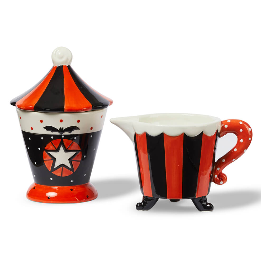 A nice, warm cup of tea or coffee is so cozy on a cold October night, especially on Halloween. Celebrate your favorite drinking ritual in a spooky, fun fashion with this Johanna Parker Carnival Cottage Cream & Sugar Set! The classic Halloween colors of black, white and orange are all over this set, with the creamer covered in stripes and a polka dotted handle while the sugar bowl has a circus big top striped lid and a star with a bat front and center on the jar. They make a great gift set, but it's so hard to give these away!