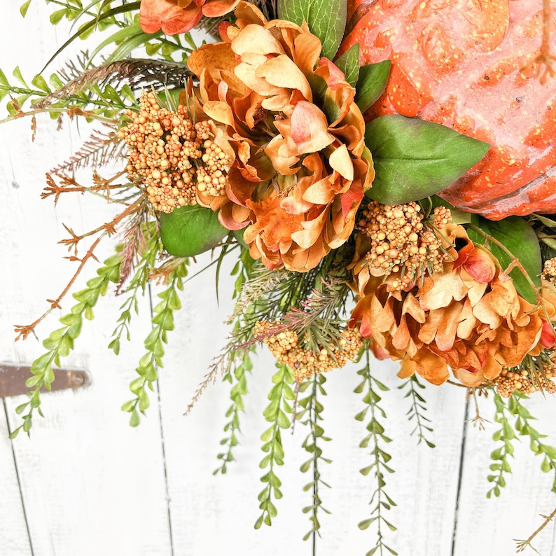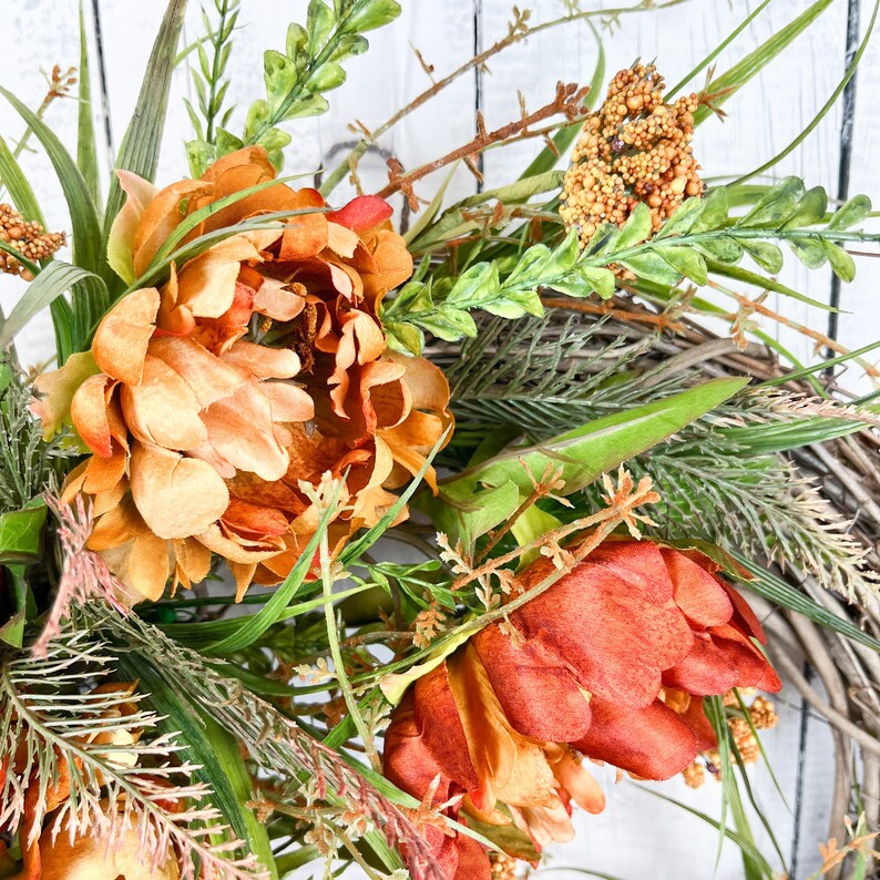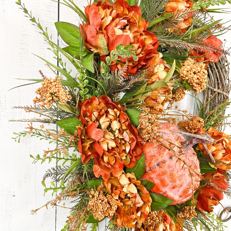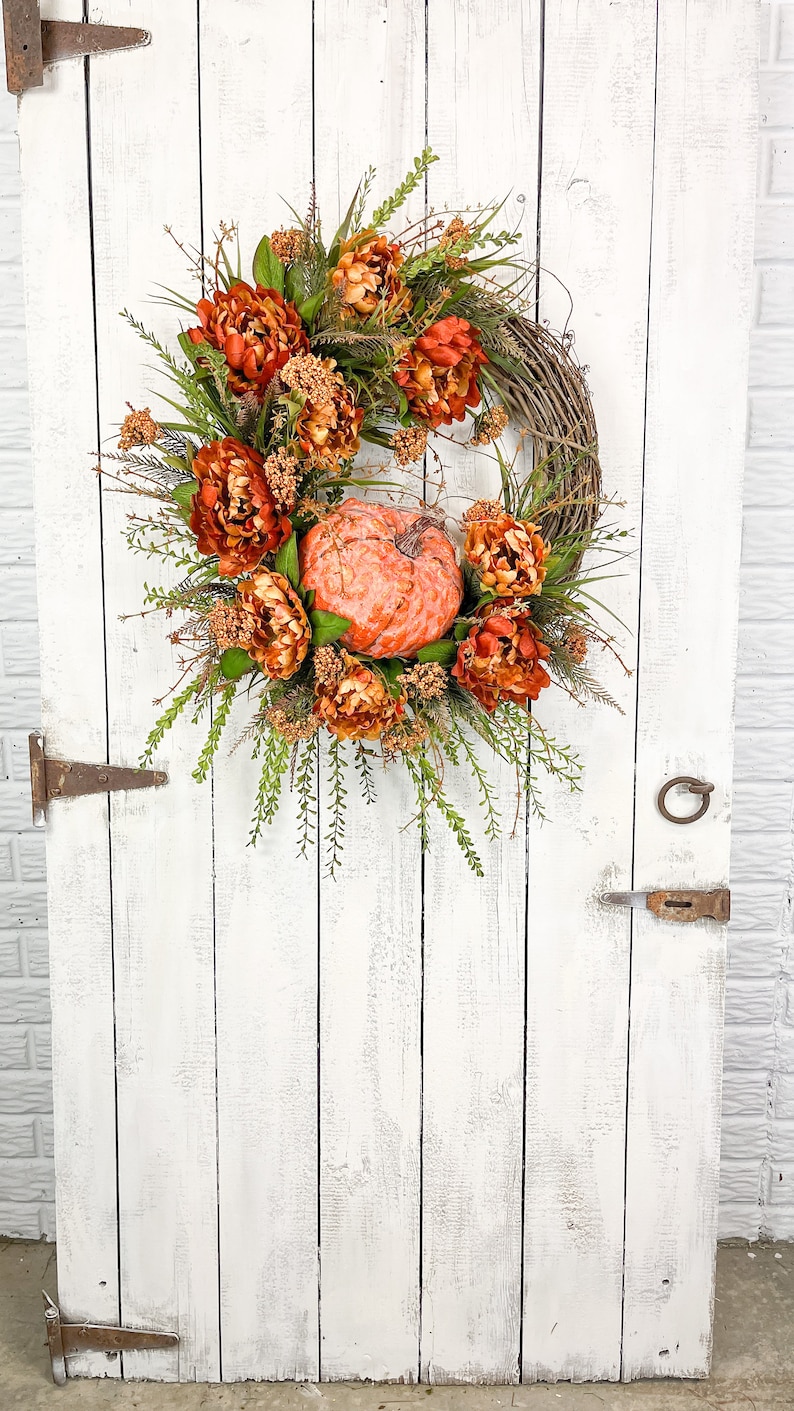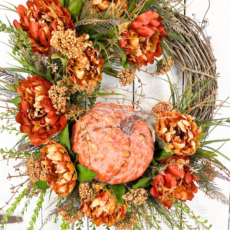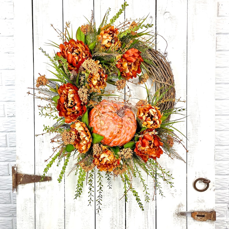 🍁Details: Packed with the vibrant colors of the season, this Fall Door Wreath showcases deep oranges, golds, browns, and greens, reflecting the changing colors of autumn leaves. Crafted on an 18” grapevine wreath base, this lush Autumn decoration boasts a variety of Fall peonies and seed pods scattered among abundant greenery. A large rustic pumpkin, a symbol of the harvest season, is securely nestled in the base of the wreath, enhancing its charm.