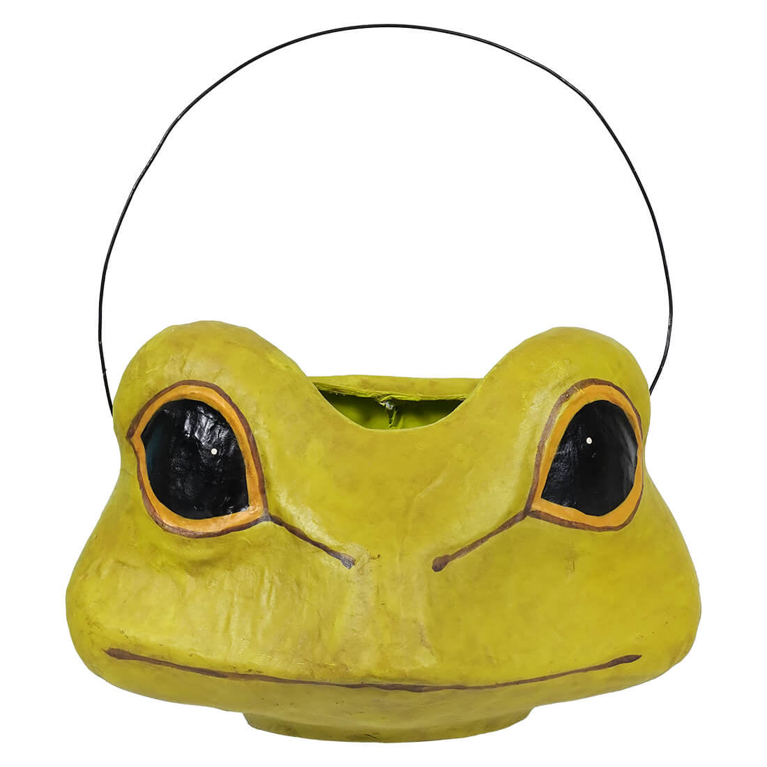 Ladies and gentlemen, allow me to regale you with a tale of whimsy and delight, brought to life by none other than the Large Froggie Bucket! Picture, if you will, a piece of decor that adds a touch of unique froggy flair to your Halloween festivities. This charming bucket, my dear companions, is no ordinary vessel. Oh no! It boasts a design that is sure to tickle your fancy—a cute frog head with big eyes and a large mouth, crafted in the classic vintage style of paper-mache. Its vintage charm shall transport you to a bygone era, where Halloween magic was woven into every thread of celebration.