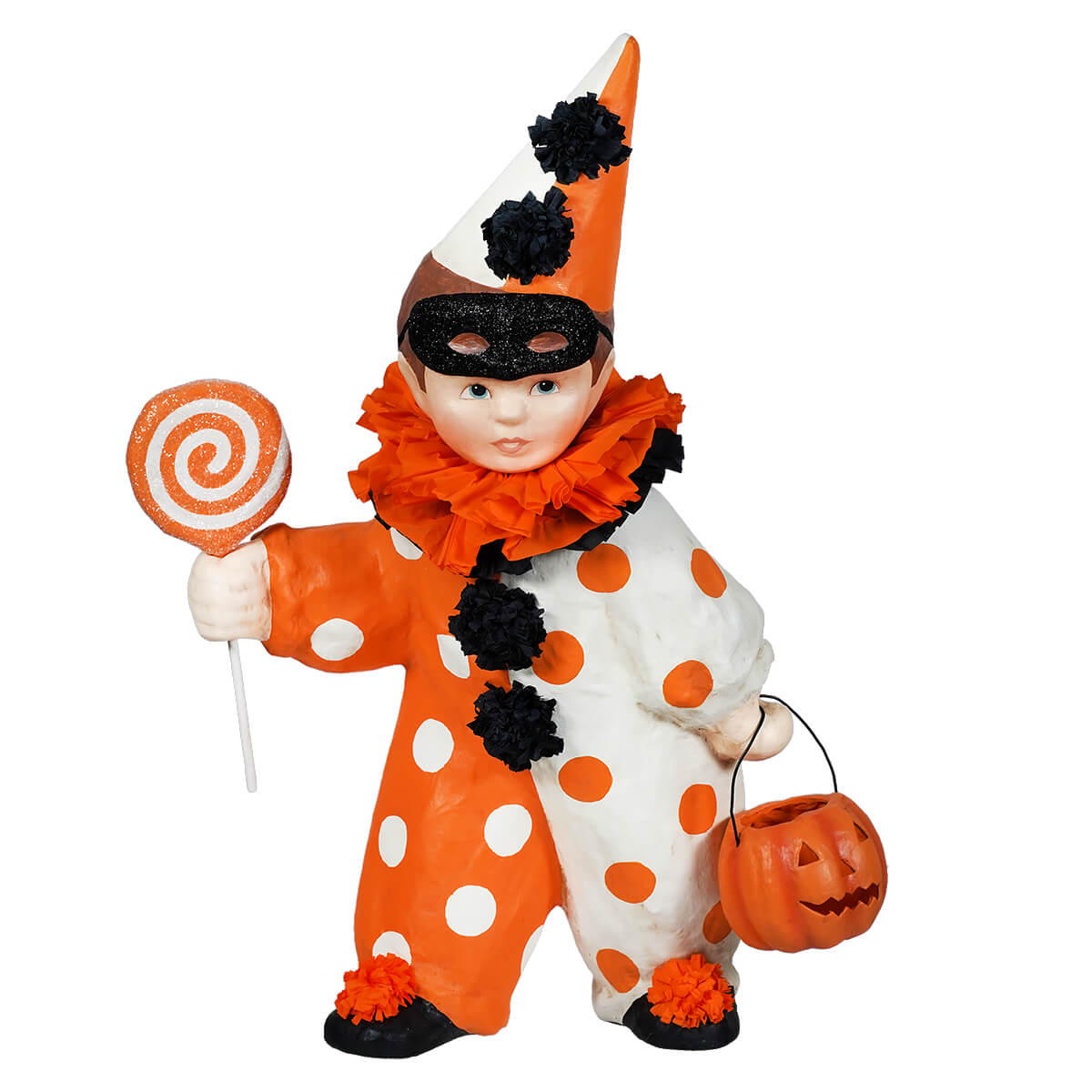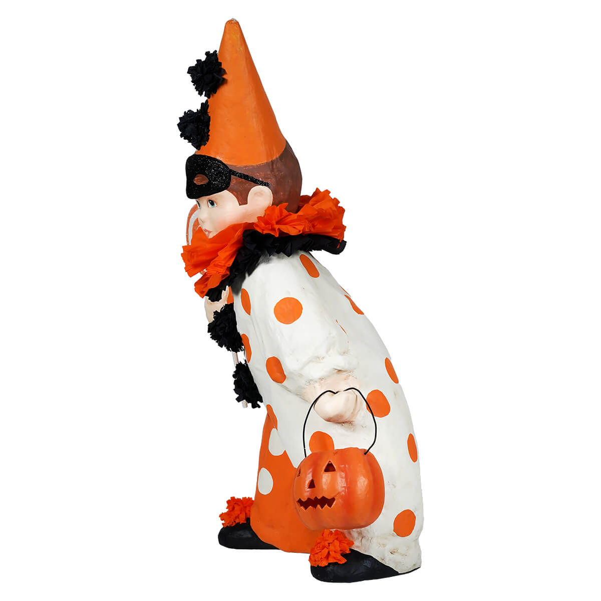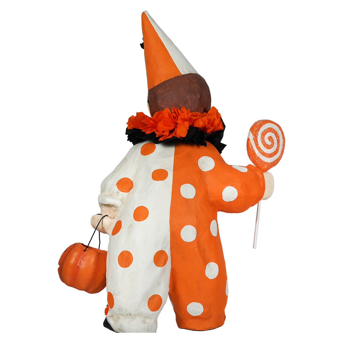 In his hands, the Large Halloween Masquerade Clown Boy carries a large swirly lollipop, but let's not forget the jack o' lantern bucket he also holds, ready to be filled with Halloween treats and surprises or a battery operated tea light, if you want to illuminate the pumpkin. Bring the magic of Halloween into your home or event with this extraordinary figure. Whether displayed as a centerpiece or standing tall among your Halloween decorations, the Large Halloween Masquerade Clown Boy promises to enamor all who encounter him. Pair him with Large Halloween Masquerade Clown Girl TJ2318) for a festive ensemble evoking all things vintage Halloween!