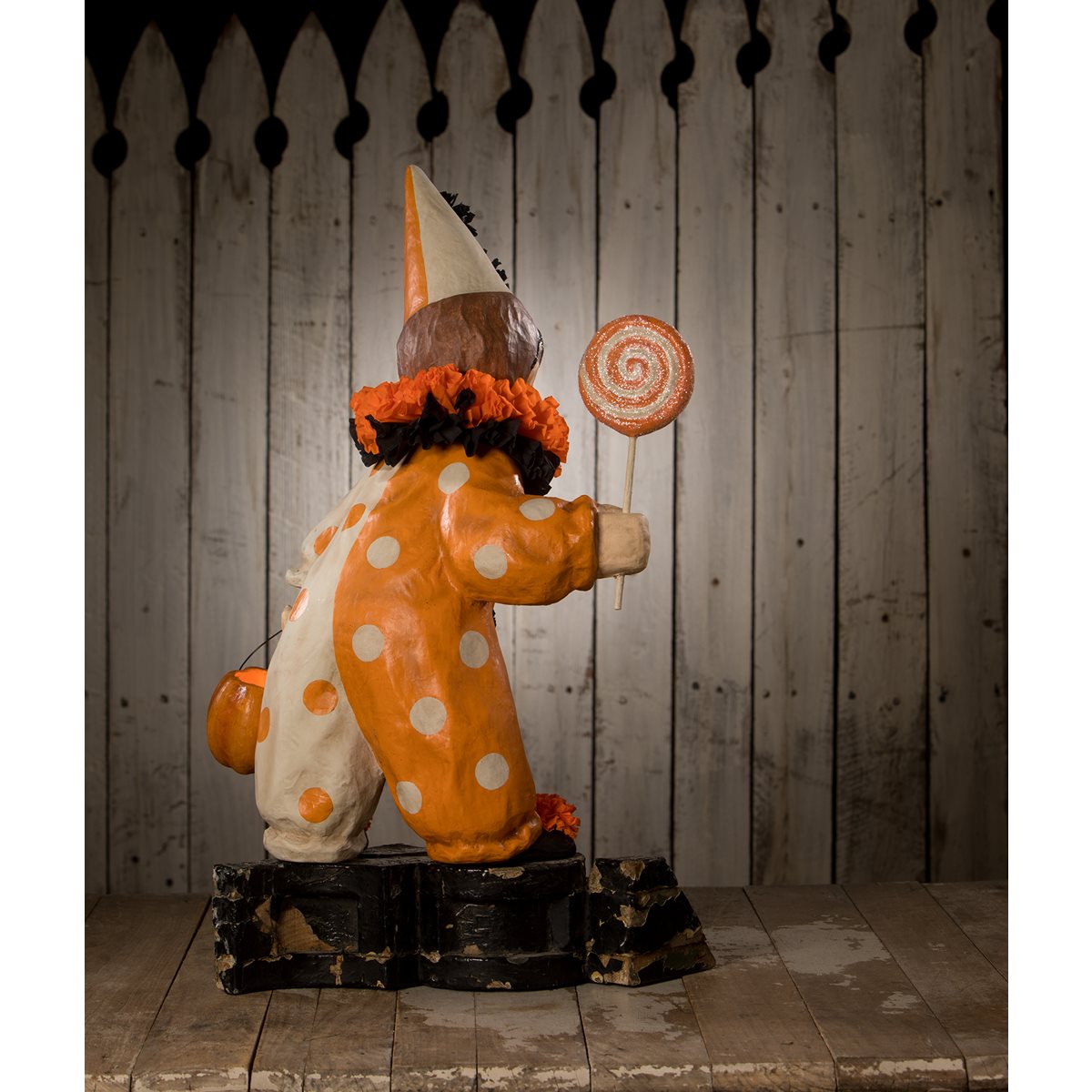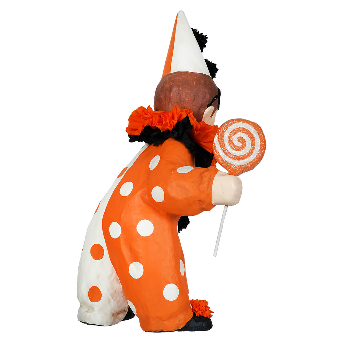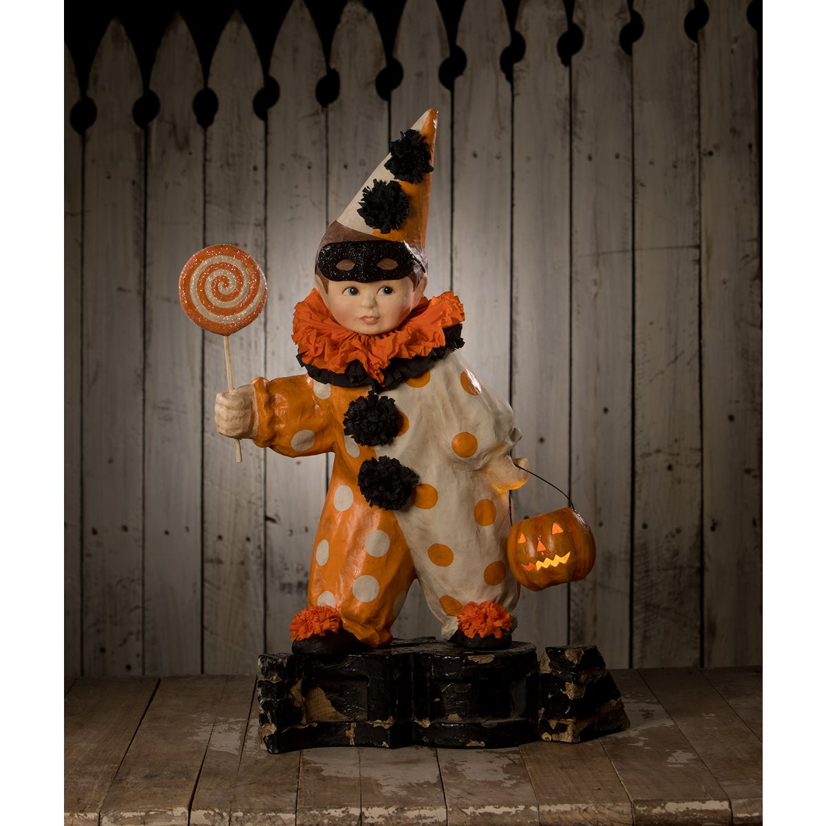 In his hands, the Large Halloween Masquerade Clown Boy carries a large swirly lollipop, but let's not forget the jack o' lantern bucket he also holds, ready to be filled with Halloween treats and surprises or a battery operated tea light, if you want to illuminate the pumpkin. Bring the magic of Halloween into your home or event with this extraordinary figure. Whether displayed as a centerpiece or standing tall among your Halloween decorations, the Large Halloween Masquerade Clown Boy promises to enamor all who encounter him. Pair him with Large Halloween Masquerade Clown Girl TJ2318) for a festive ensemble evoking all things vintage Halloween!