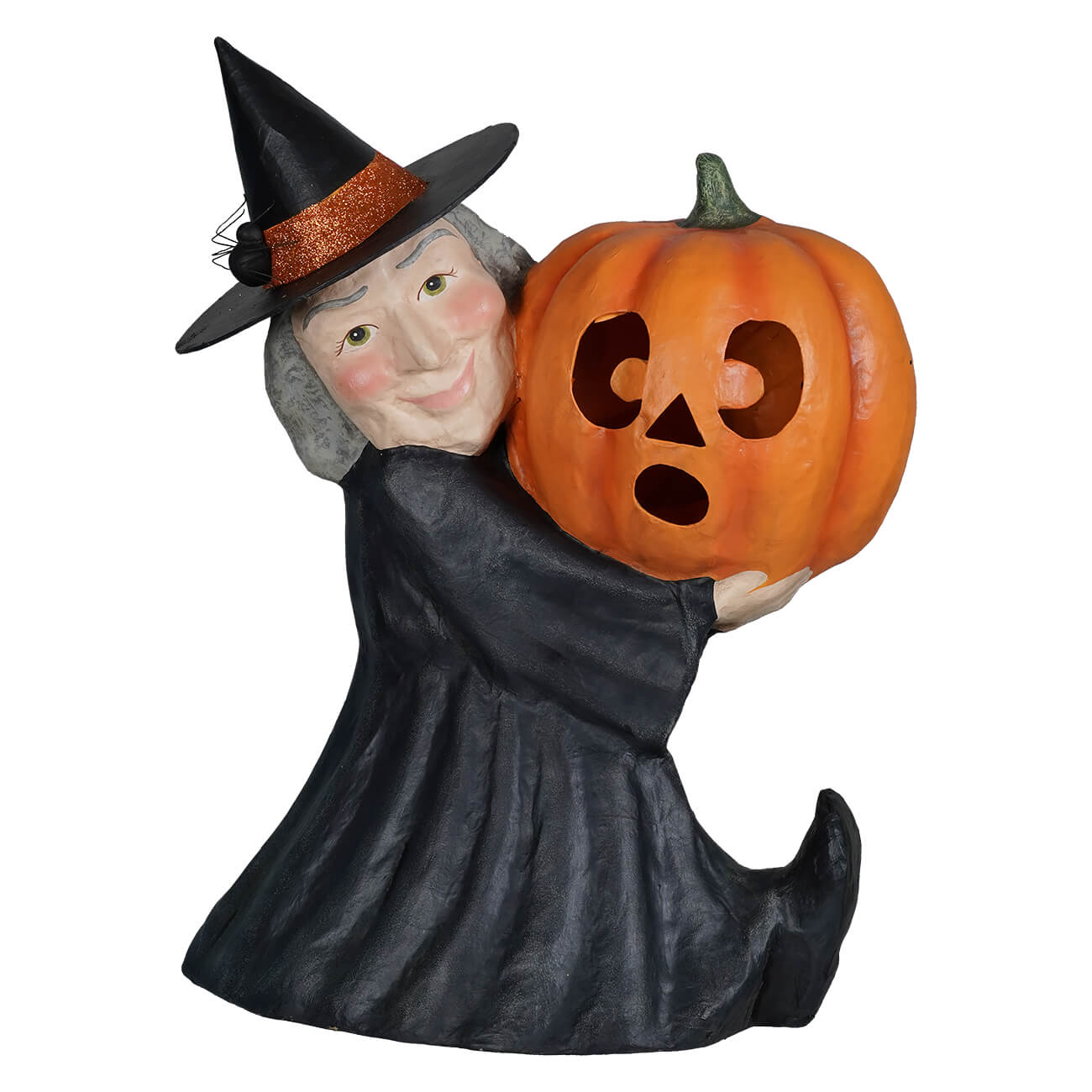 The Large Witch With Pumpkin standing tall at 19 inches, is a delightful, vintage style paper mache decoration that brings a lighthearted touch to your Halloween decor. With a carved pumpkin in her grasp, the cheerful witch roams in search of the perfect spot to showcase her prized jack. A smile adorns her face, radiating warmth and mischief as she embarks on her Halloween adventures.The magical allure of the Large Witch With Pumpkin reaches its peak when the pumpkin's face comes alive with a gentle glow. Simply insert a C7 light into the hole at the back, and watch as the pumpkin's features illuminate. Whether displayed on its own or as part of a festive arrangement, this witch and her pumpkin gives your Halloween celebrations an inviting atmosphere.
