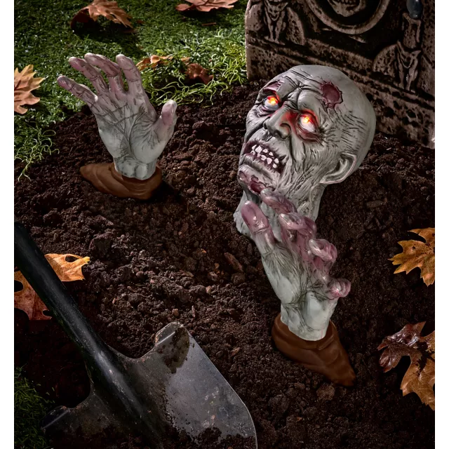 Looking to take your d茅cor game to the next level? This Light-Up Ground Breaking Zombie Head is sure to make your blood run cold. One look at this grotesque, rotting corpse, and every passerby will know that the dead roam the Earth.�