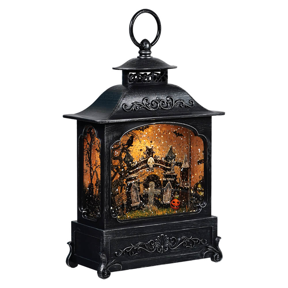 Are you looking for a unique way to bring a bit of spooky fun to your Halloween display? Well look no further than this Lighted Spinning Graveyard Water Lantern! This mesmerizing water lantern is sure to make your friends and family take a second look. The intricately crafted graveyard scene creates an eerie atmosphere, with all sorts of mysterious details that will keep people looking and discovering new features. Whether placed indoors as a center piece or in a collection or placing it on a shelf or table alone, the hauntingly lit-up spinning scene will be sure to add a little extra spookiness to your Halloween festivities! Get ready to immortalize the spirits of the underworld in this lighted spinning graveyard water lantern!