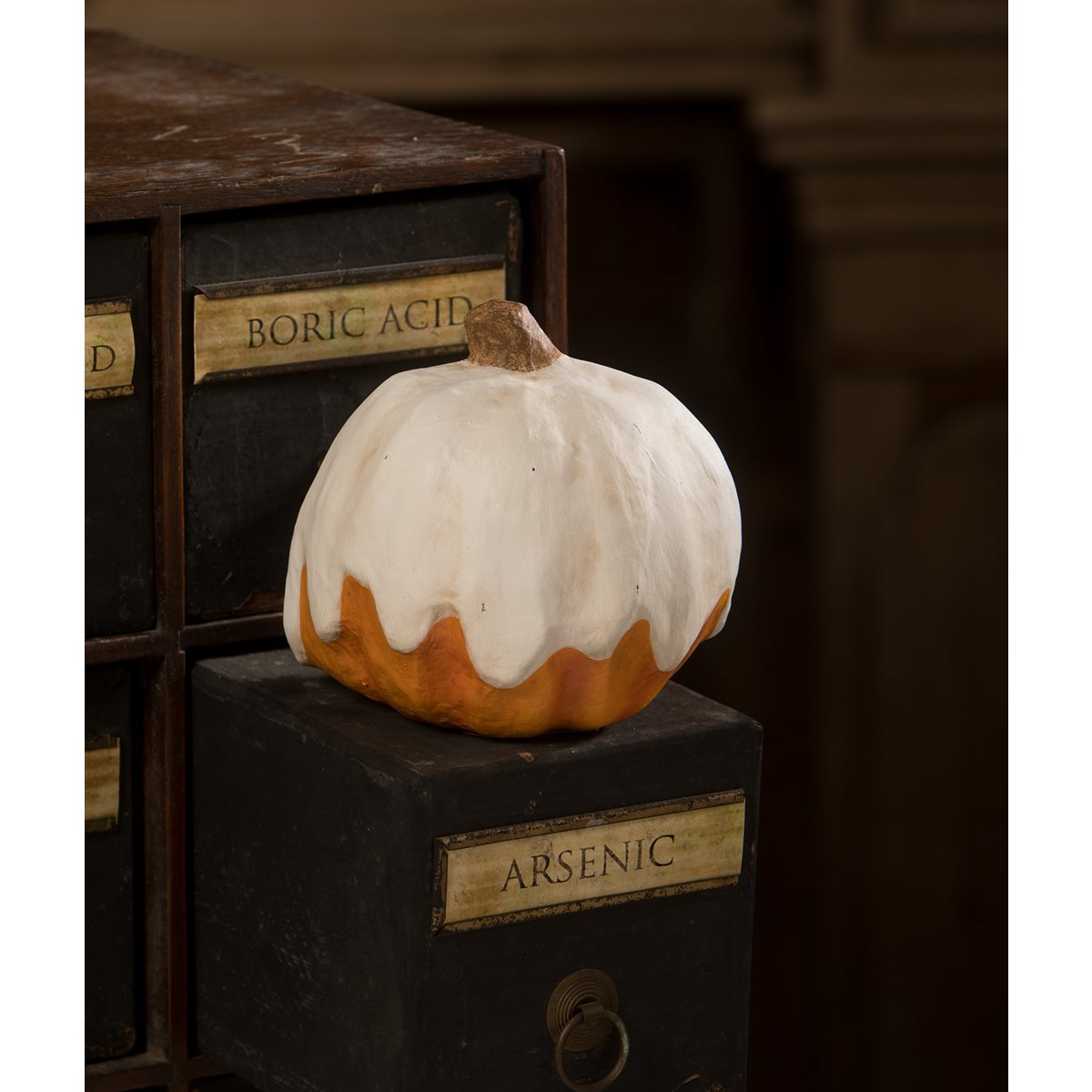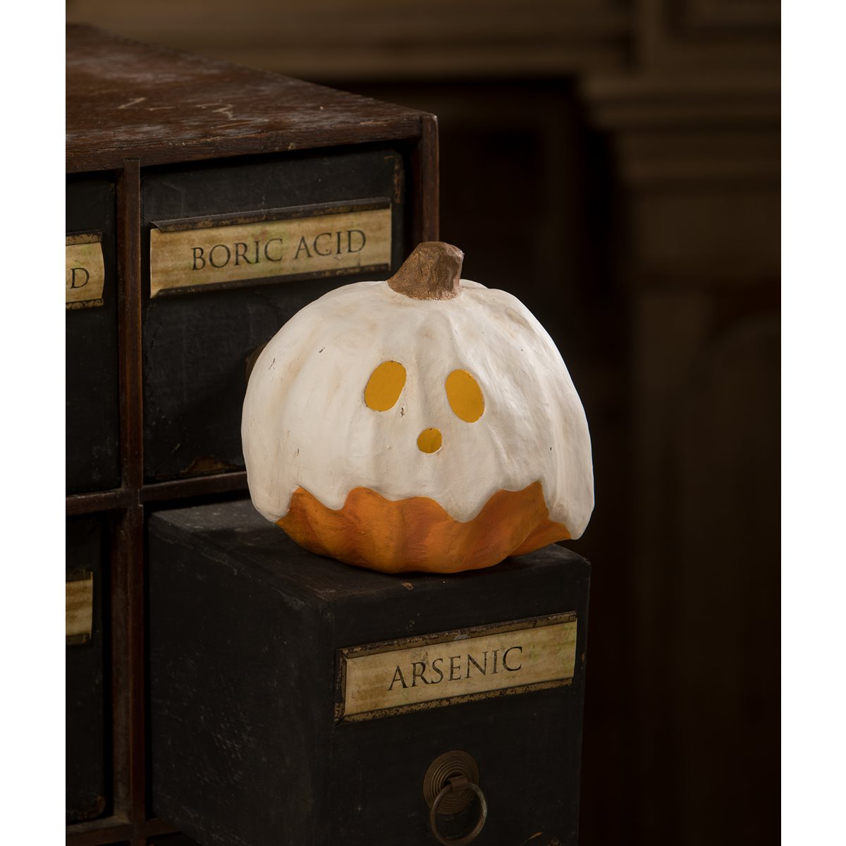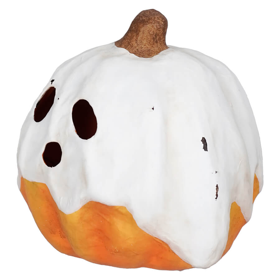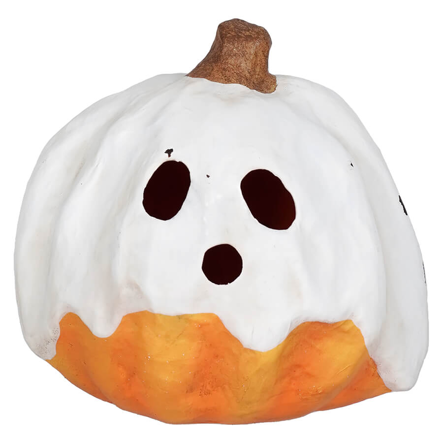 On a mystical Halloween night, the Medium Ghost Jack Luminary emerged from the dark, enthralling all who beheld its ghostly appearance. With a flickering glow, it cast an enchanting spell, illuminating the path for trick-or-treaters as they ventured through the night in search of candy. Made to look like he was coated in a layer of oozing white wax, this mischievous jack looks like a spooky ghost! With a convenient hole at the bottom that allows for easy placement of an electric tea light, it casts a mesmerizing glow that brings the ghostly face to life. Versatile in its compact size, the Medium Ghost Jack Luminary can be placed on shelves, mantels, or tabletops, adding a hauntingly delightful touch to your Halloween display. Pair it with the other Bethany Lowe Ghost Jack Luminaries for an enchanting ensemble of ghostly pumpkins that will delight all who behold them.