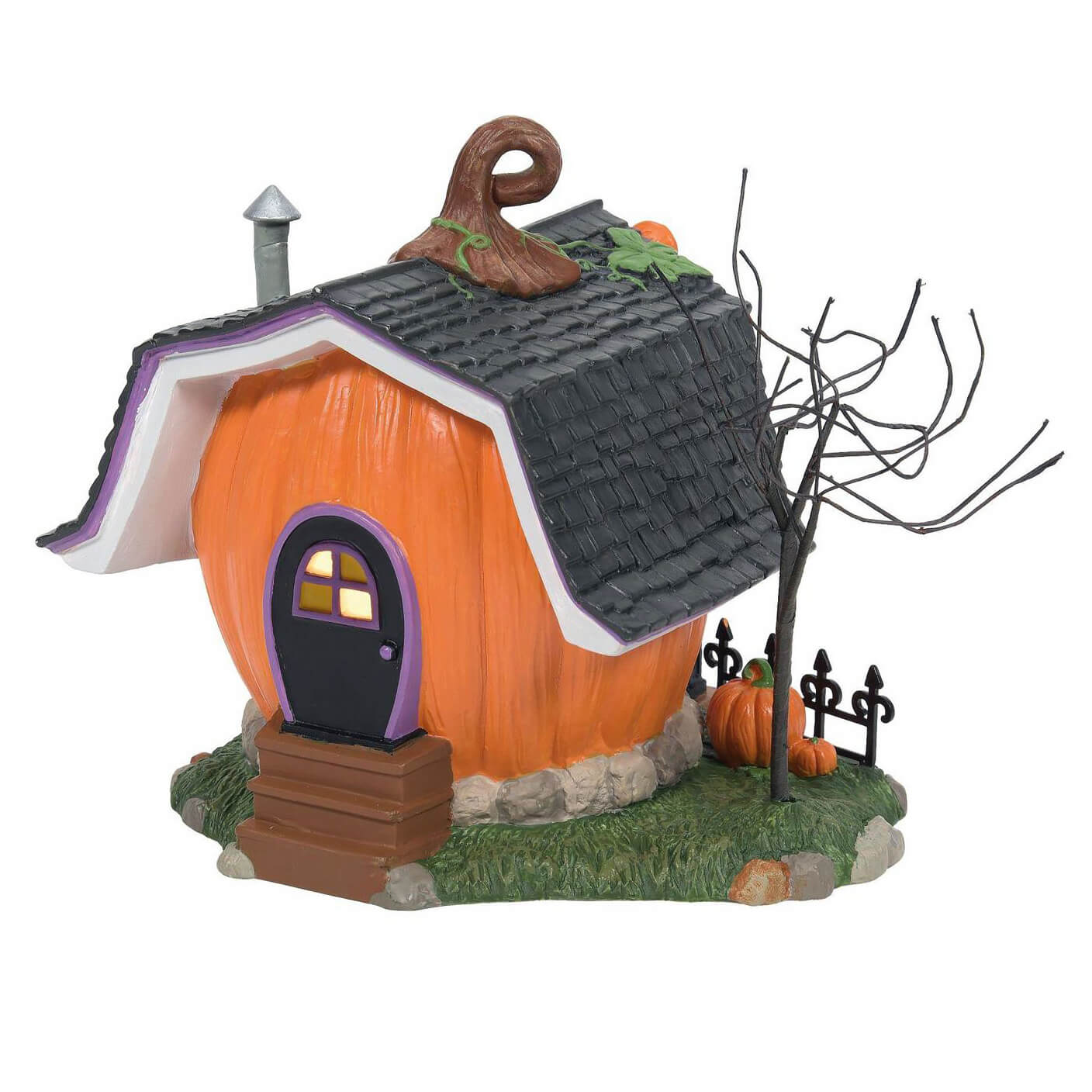 From Department 56, the Pumpkintown Carving Studio showcases a delightful pumpkin home, radiating warmth and coziness. Its textured exterior and carefully designed windows and doors bring this charming abode to life.