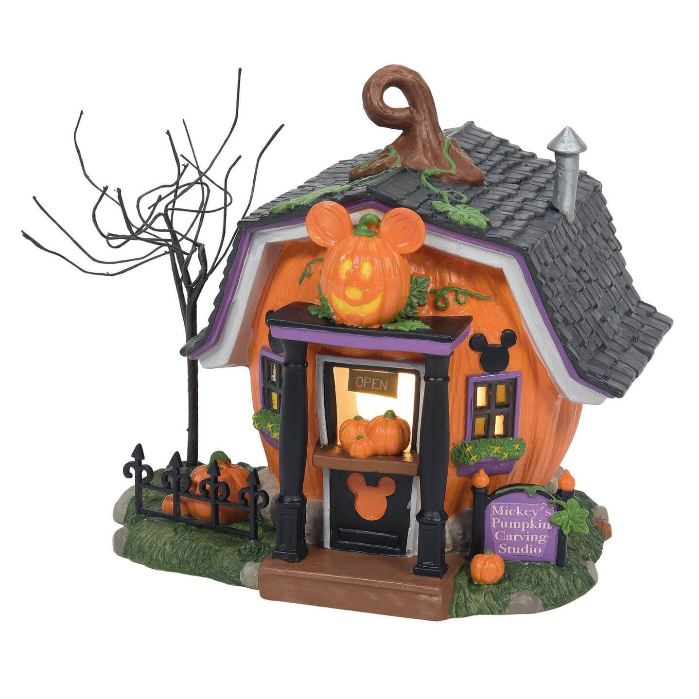 Add a touch of Disney magic to your Halloween display with the Pumpkintown Carving Studio. This delightful piece captures the essence of Mickey Mouse and Pumpkintown, making it a cherished addition to your holiday decorations."