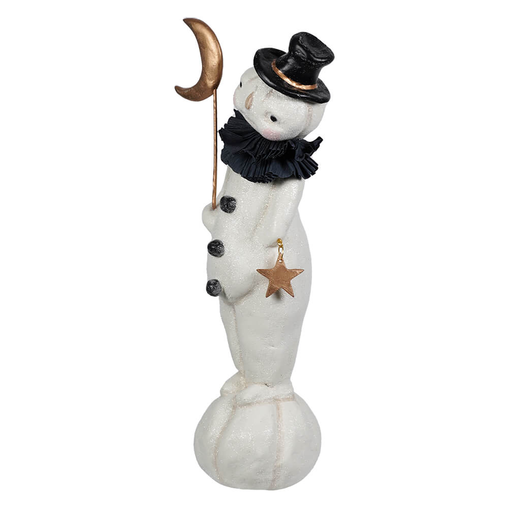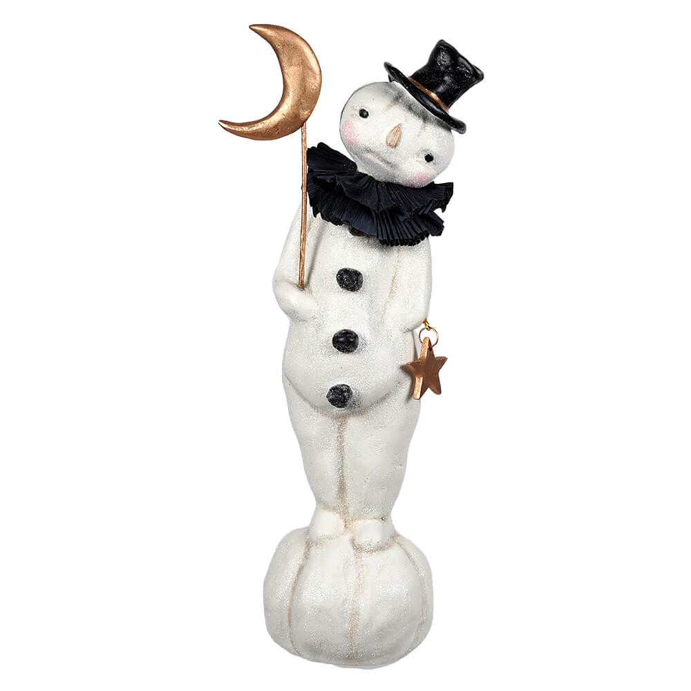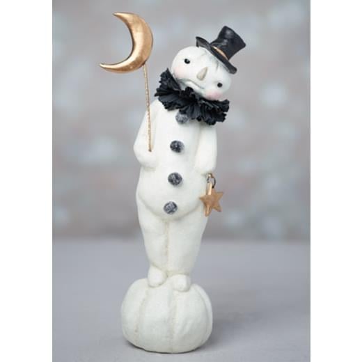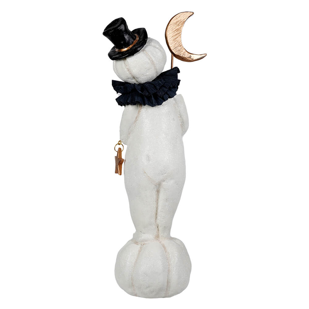 Moon Beam's appearance is both intriguing and delightful. Whether you envision him as a ghostly figure for Halloween or a friendly snowman for Christmas, he is ready to adapt to your needs and preferences. Atop his slightly askance moon faced, white pumpkin head, he dons his stylish black top hat and a crepe paper collar, Moon Beam holds a golden moon in one hand and a star in the other, adding a touch of celestial beauty to his overall design.
