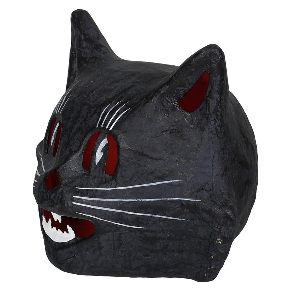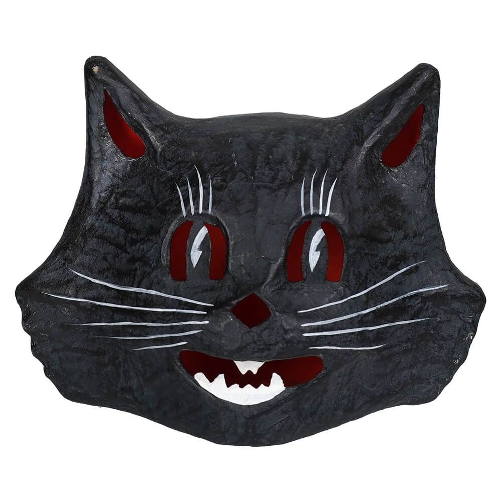 Crafted in a classic paper mache, the Mr. Shady Cat Luminary has a cheerful expression that will instantly brighten any room. But Mr. Shady Cat only really comes to life when you add an electric tea light to the convenient hole at the bottom. Watch as the warm glow permeates through his eyes and mouth, creating a captivating ambiance that is both nostalgic and enchanting. With its fun design and timeless appeal, this luminary is the perfect addition to your Halloween or vintage-themed decor.