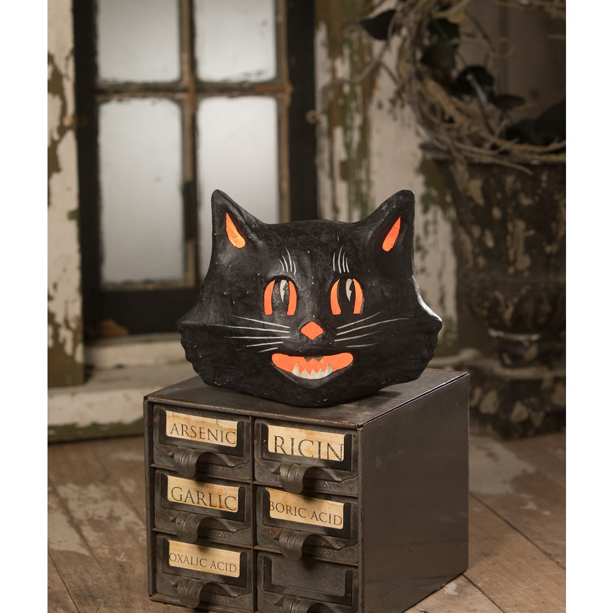 With his captivating gaze and a flickering spark of mischief within his eyes, the Mr. Shady Cat Luminary casts an irresistible charm over all who encountered his enigmatic presence. A toothy grin, pointed ears and painted on white whiskers all come together to make him the cat's meow!