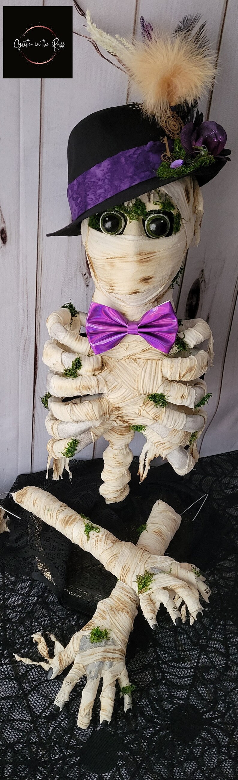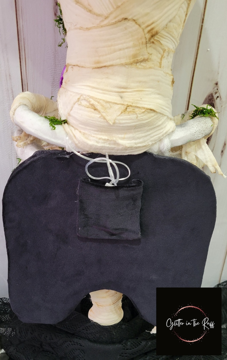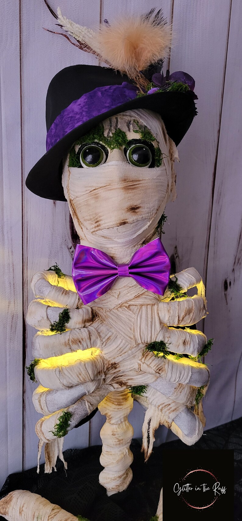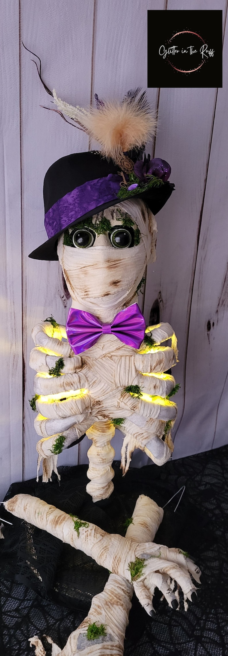 From his stylish top hat to his wrapped mummified toe nails each part is crafted with great detail and quality materials to give you that customer wow factor centerpiece. He features detailed painting in the face and hands, sewed arms and bottom half with air clay toenails, The entire body is wrapped in a wrinkled gauze cotton material, colorer dipped for an aging look, air dried then applied, topped with a stylish hat for only a Mu...Mu..Skelly Mummy Man can wear. There are 2 Sets of LED lights placed in the chest cavity to light up for that spooky wow effect.