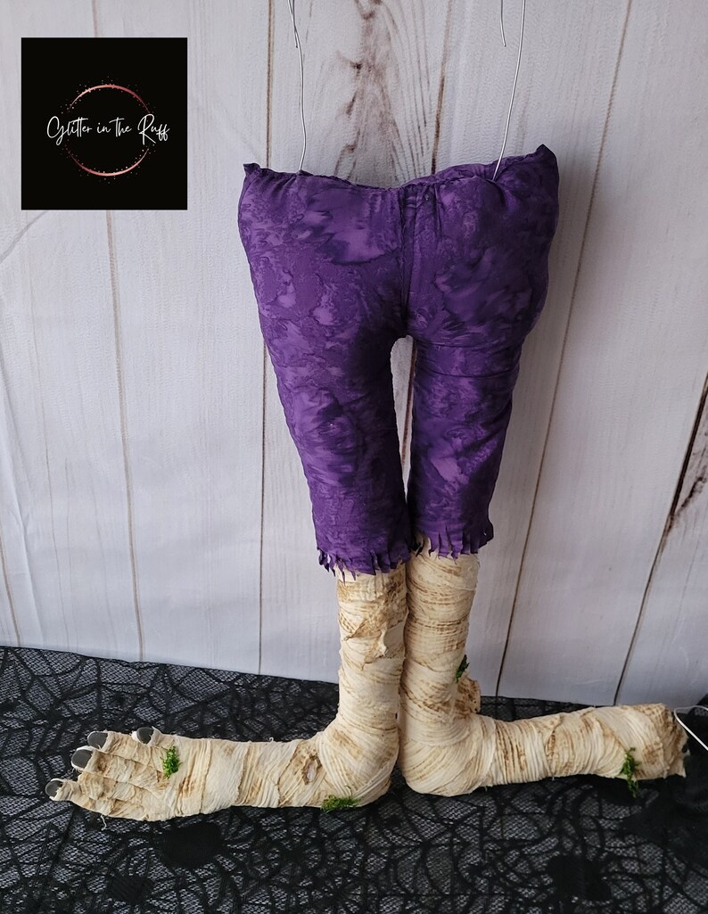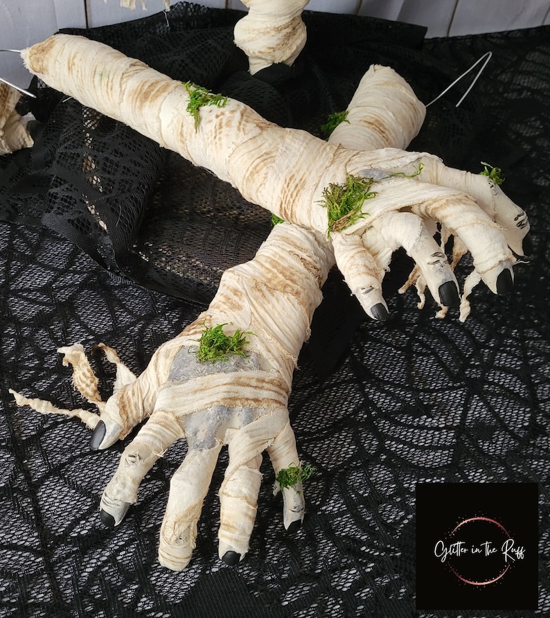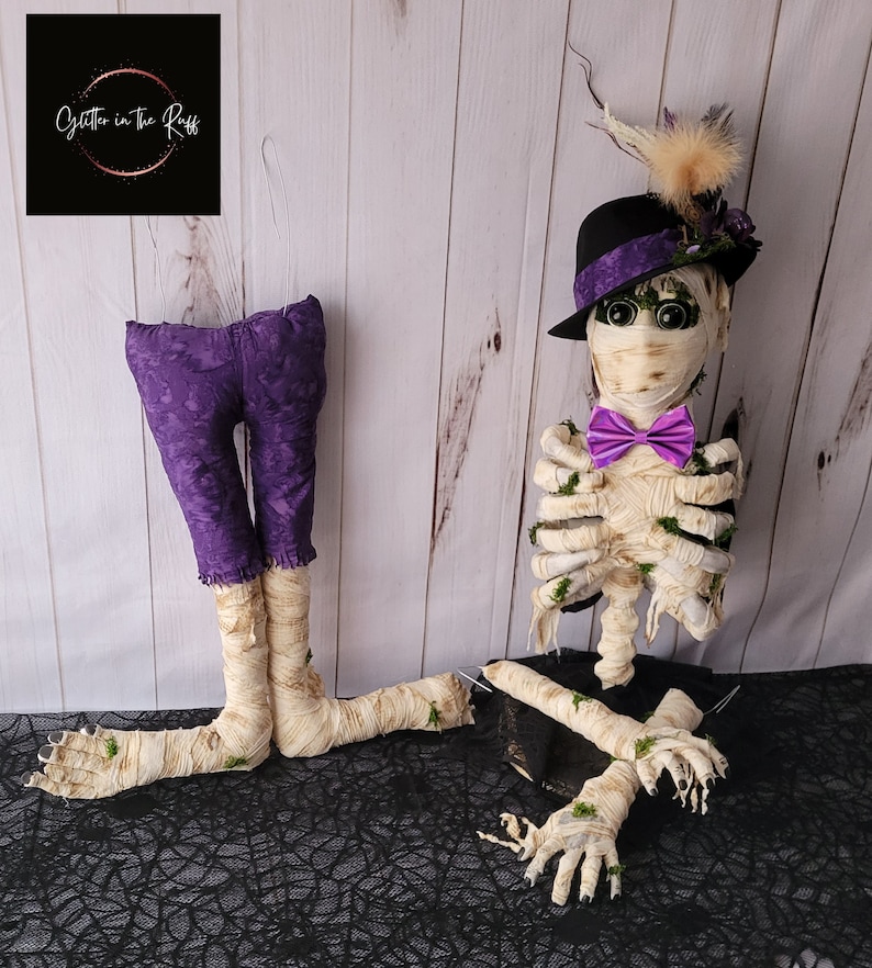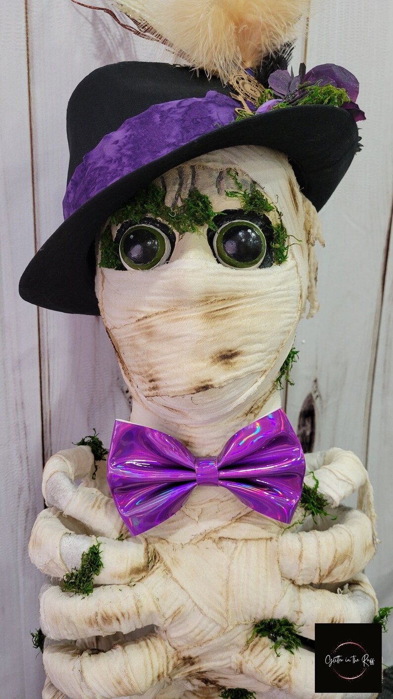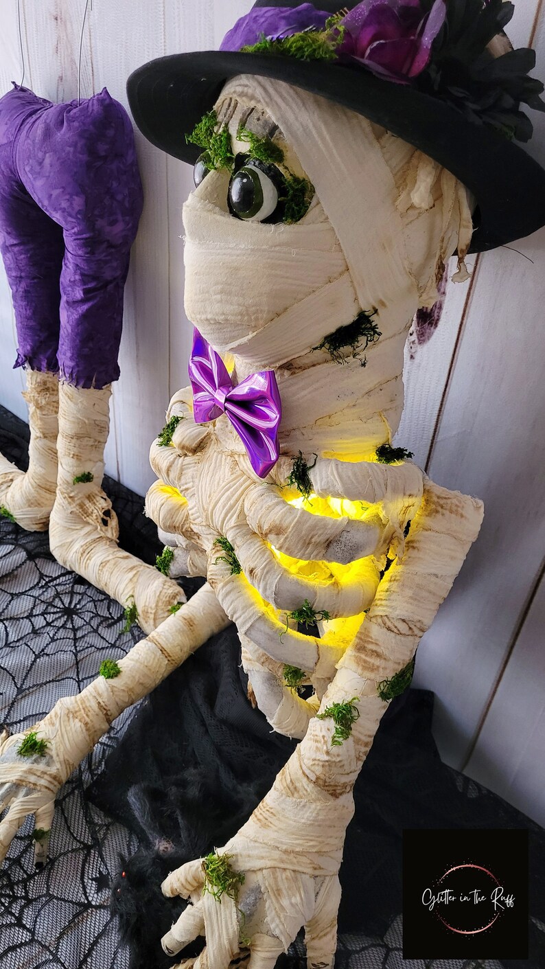 From his stylish top hat to his wrapped mummified toe nails each part is crafted with great detail and quality materials to give you that customer wow factor centerpiece. He features detailed painting in the face and hands, sewed arms and bottom half with air clay toenails, The entire body is wrapped in a wrinkled gauze cotton material, colorer dipped for an aging look, air dried then applied, topped with a stylish hat for only a Mu...Mu..Skelly Mummy Man can wear. There are 2 Sets of LED lights placed in the chest cavity to light up for that spooky wow effect.