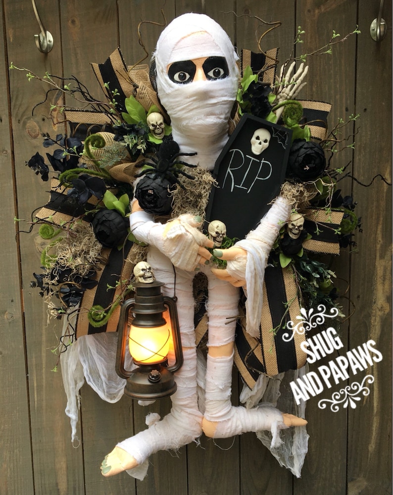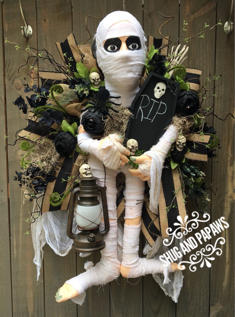 This is a large deluxe Halloween wreath . This large whimsical spooky Halloween wreath is built on an evergreen base with burlap and black mesh . This large Mummy appears to be walking out of the spooky 👻 woods on Halloween night . He is surrounded by spooky curly faux wood sprays, black florals and curly moss stems . Small skulls scattered throughout the wreath . Premium 4 inch ribbon. This mummy is stepping out of the Halloween night carrying a casket sign in one hand and a flaming battery operated (also includes remote control) lantern. This is a large wreath measuring 38 inches long , 27 inches wide and 12 inches thick. The mummy is inspired by tutorial and pattern offered in the Petal and Plumes members only group and the wreath is from a tutorial in Babam’s Inside Scoop taught by Angel Hollaway.