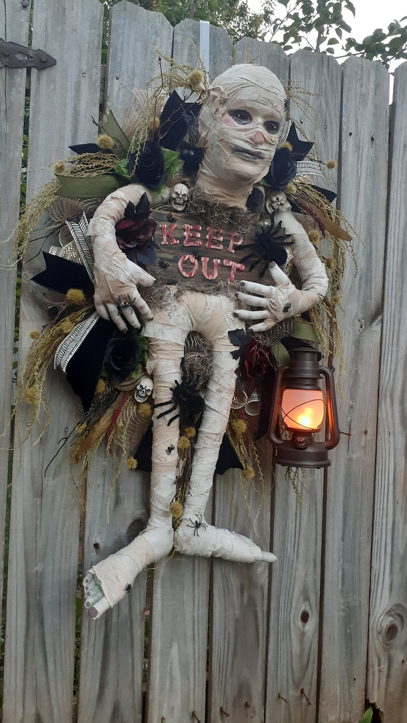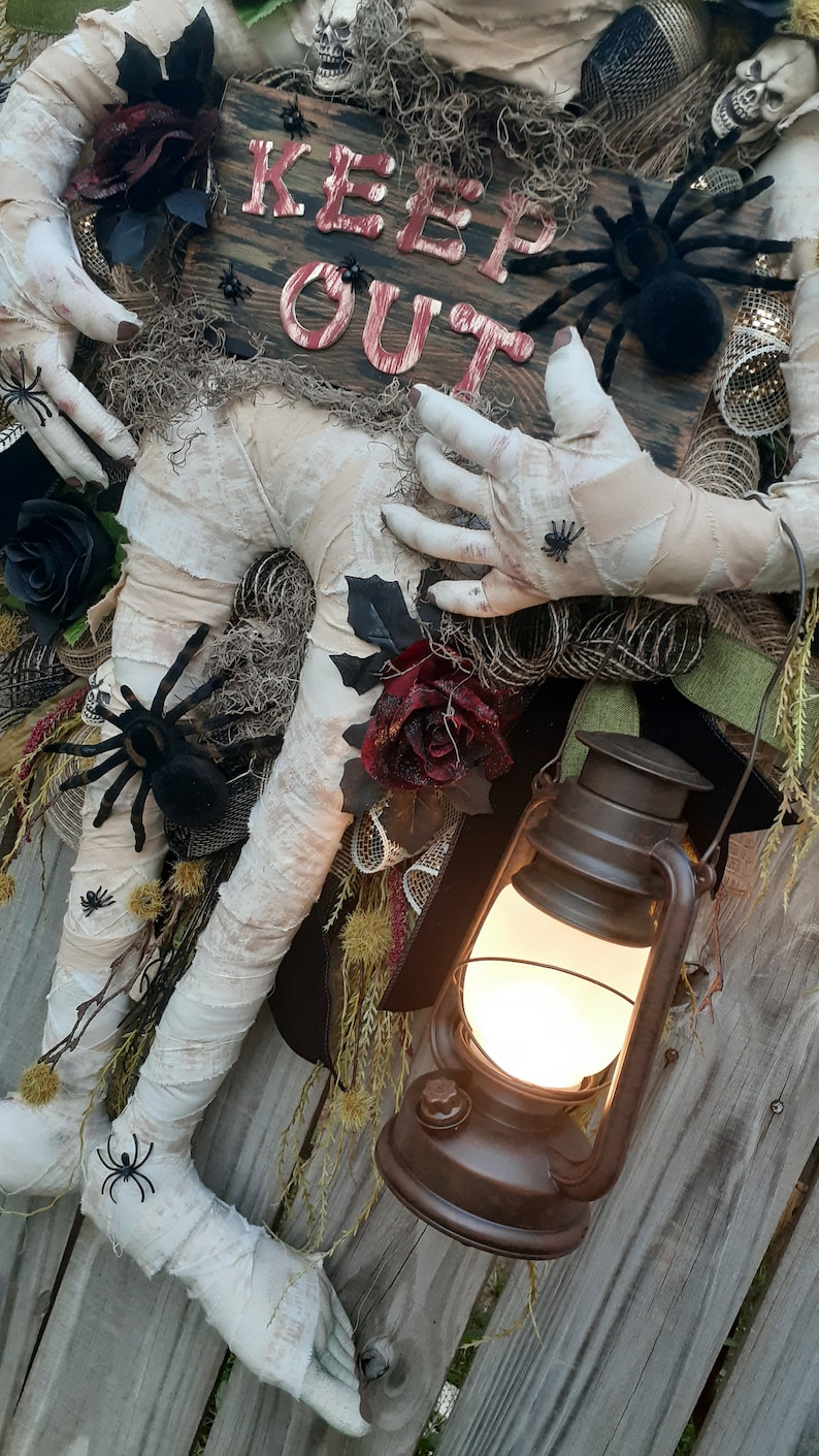 This mummy is truly an EYE catcher and will take your Halloween decor to the TOP! "Absolutely Breathtaking!" is what your guest will be when they see this 4 ft. Mummy! If you want to go all out on your Halloween decor and add a "WOW" factor, then look no more! This 100% handmade piece has all the bells and whistles and will not disappoint. Features a hand-sewn mummy a hand-painted wooden sign lush black and burgundy florals, creepy greenery and moss, 2 giant furry tarantulas and spiders all throughout to add to this scary creature!🕷🕷🕷 And to top it all off it comes with a real working lantern that is battery operated and includes a remote control to change the settings to a lamp mode or a flickering flame mode.
