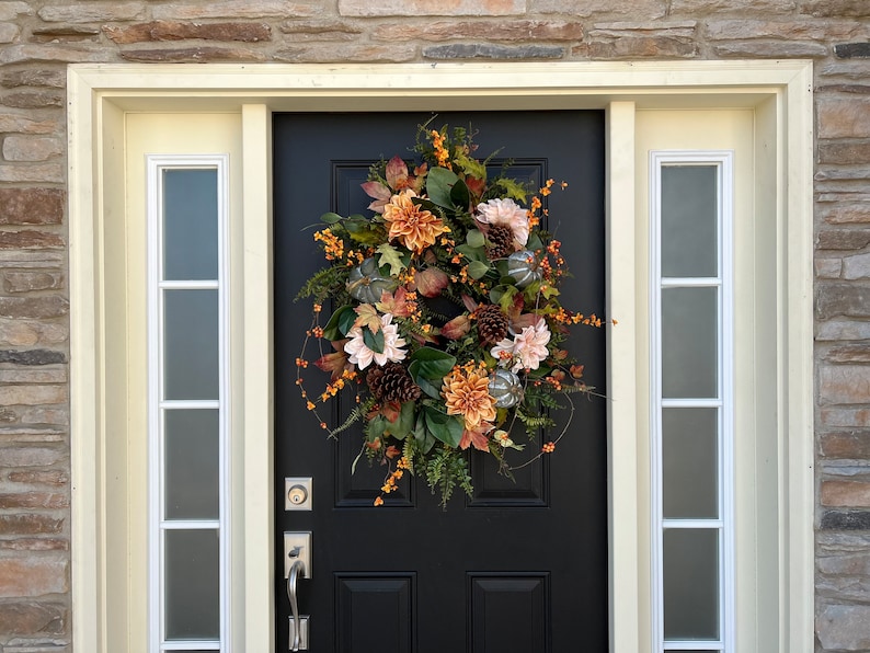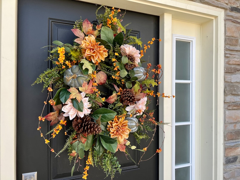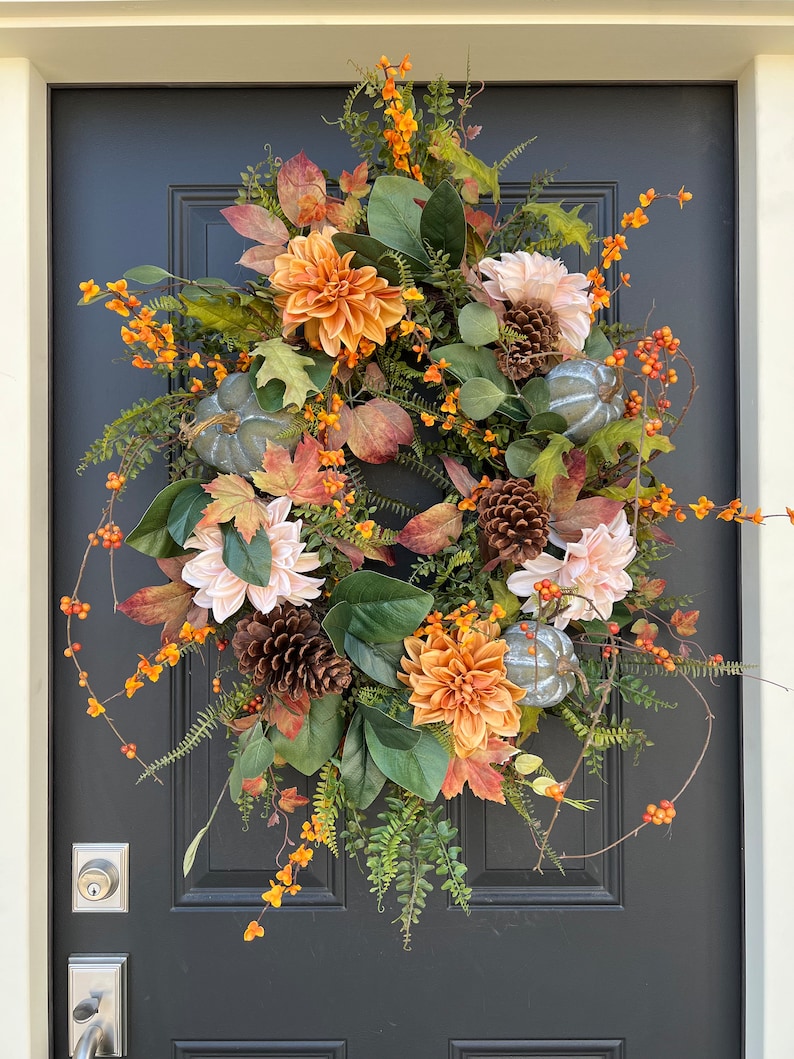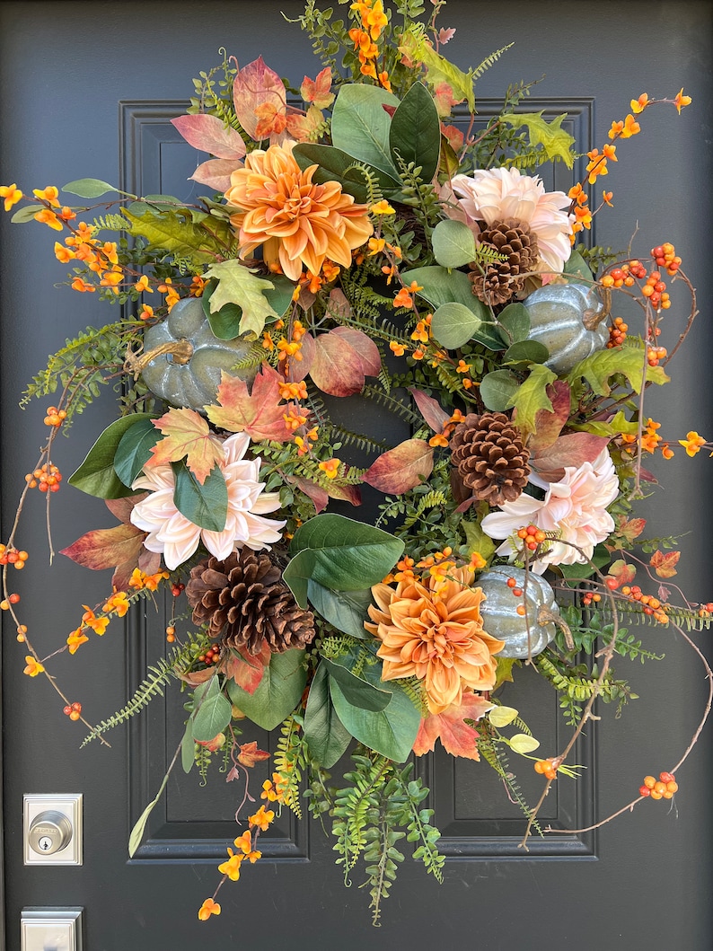 The Harvest Moon Pumpkin and Gourd Wreath for Fall is a realistic blend of everything fall for your front door! From gorgeous fall colored florals, pumpkins and natural pinecones to fall berries, fall fern and vines, this autumn wreath is sure to be a hit on your front door this season! Don't delay with your purchase, we are creating just a few in this custom design for the season!