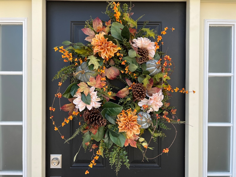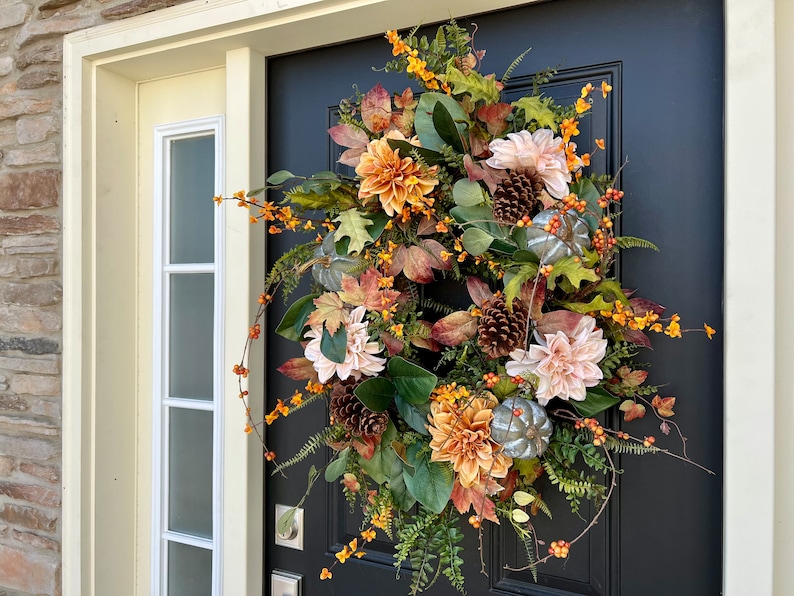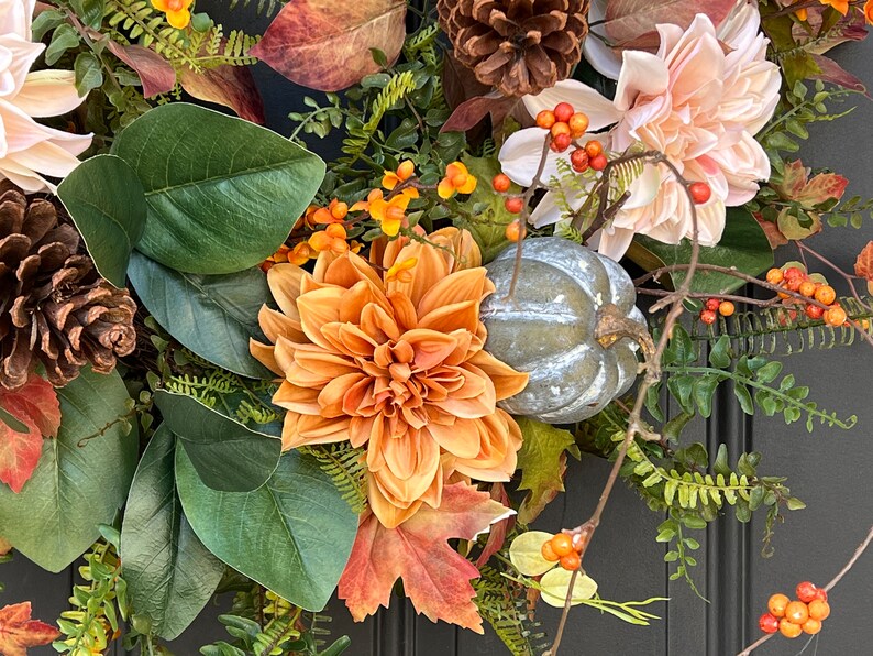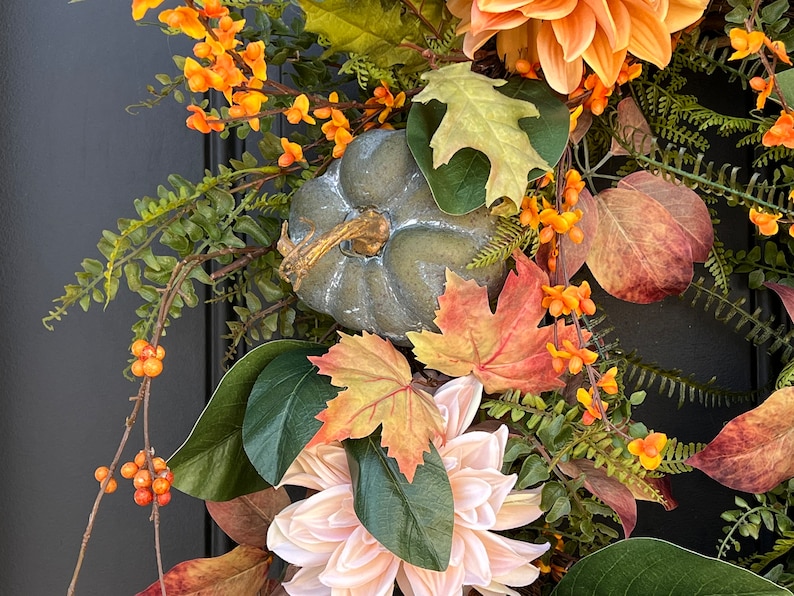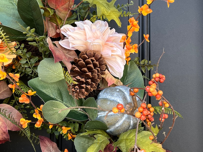 - Features fall faux fern, pumpkins, fall flowers, natural pinecones, berries and more