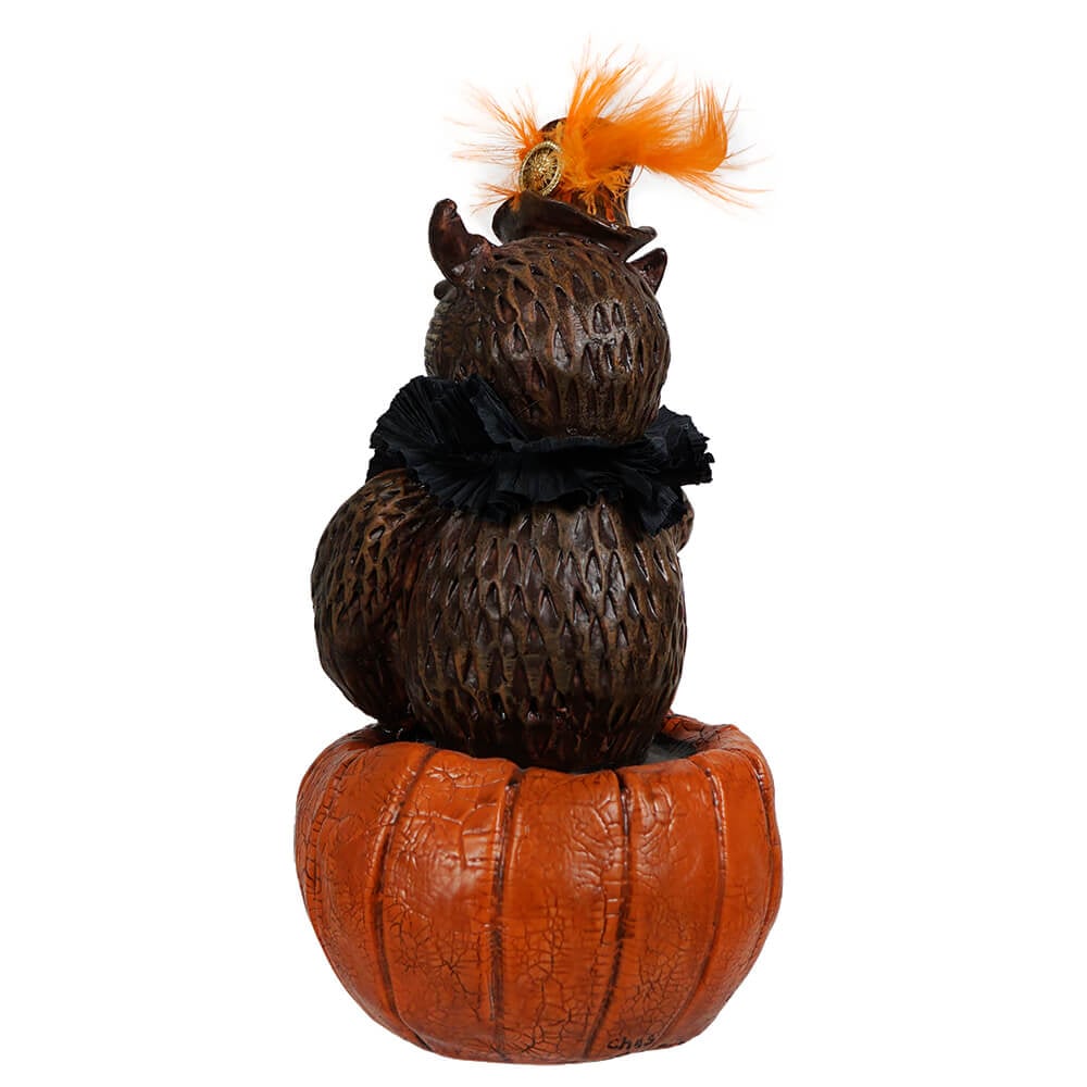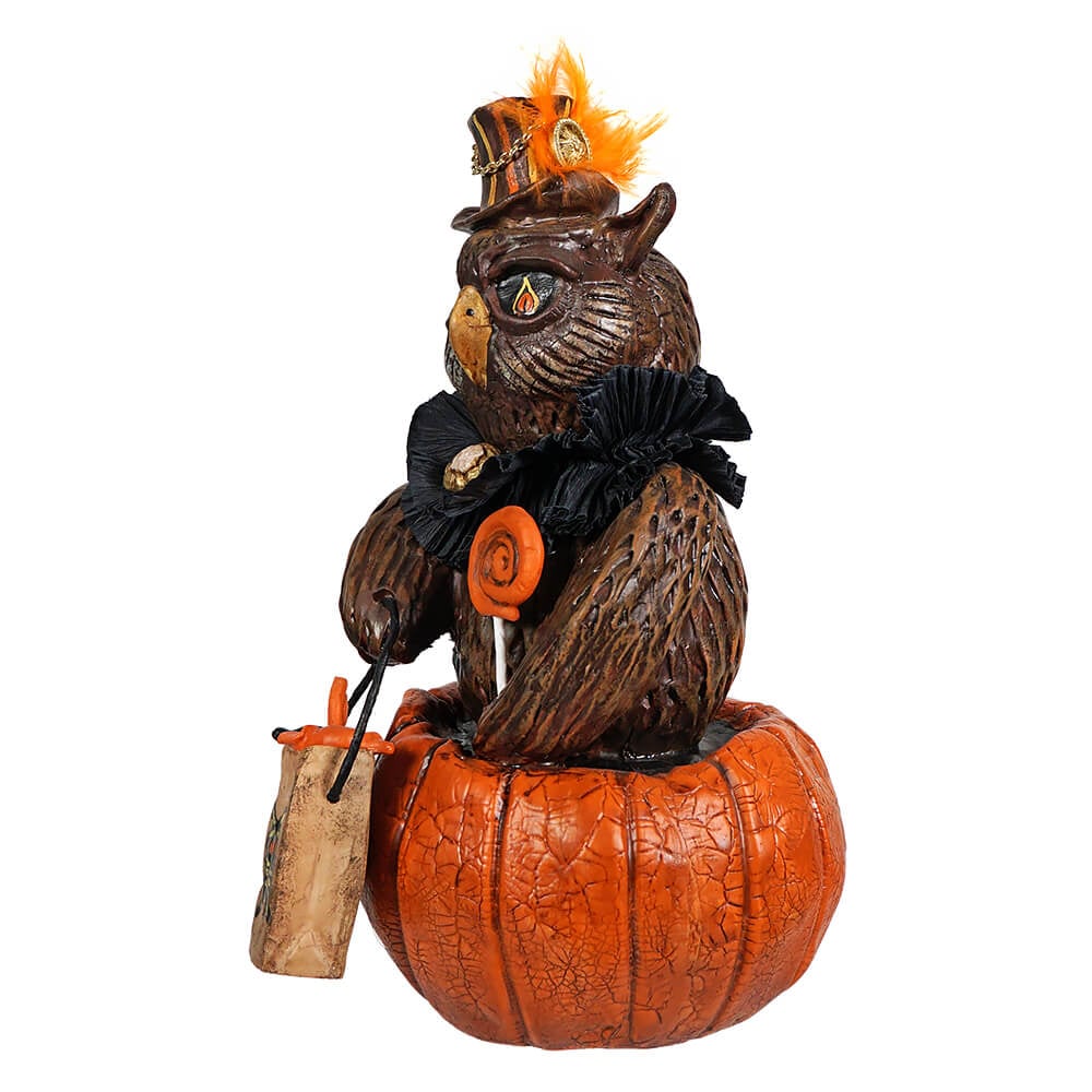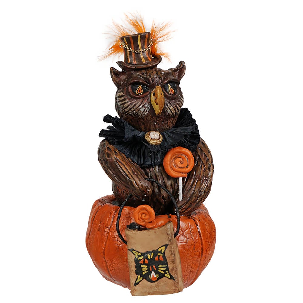 Hoot, Hoot! Meet Oliver, the festive feathered friend that’s here to add a touch of Halloween charm to your home. With his striped feathered hat and smart black crepe paper collar, this 8.5-inch tall resin figure looks as though he’s stepped right out of a storybook full of Halloween tales. Sitting atop his pumpkin perch, he is handing out goodies from his bag to all the trick or treating kids coming his way. He may look stern at first glance, but it is hard not to warm up to this festive owl. Give Oliver a spot on your mantel or shelf, or even your work desk and like him fill your days with the spirit of Halloween!