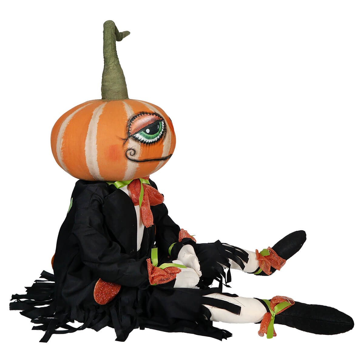 Add a touch of wicked whimsy to your Halloween decorations this year with the Pablo Figure doll! Designed by the illustrious Joe Spencer, this figure will bring a smile to all your guests this Halloween season. With a big pumpkin head, nonchalant eyes and a mischievous lazy smile, Pablo is sure to become the life of your haunt. His tattered suit and BIG green and orange glittered dots all over the front and back of his suit gives him plenty of Halloween style, and his 42 inch height is sure to draw stares from all who come across him. Pair him with the Petra Figure and you’ll have a delightfully impish pair to really give your decor some style!