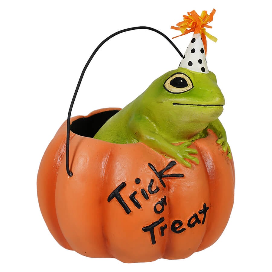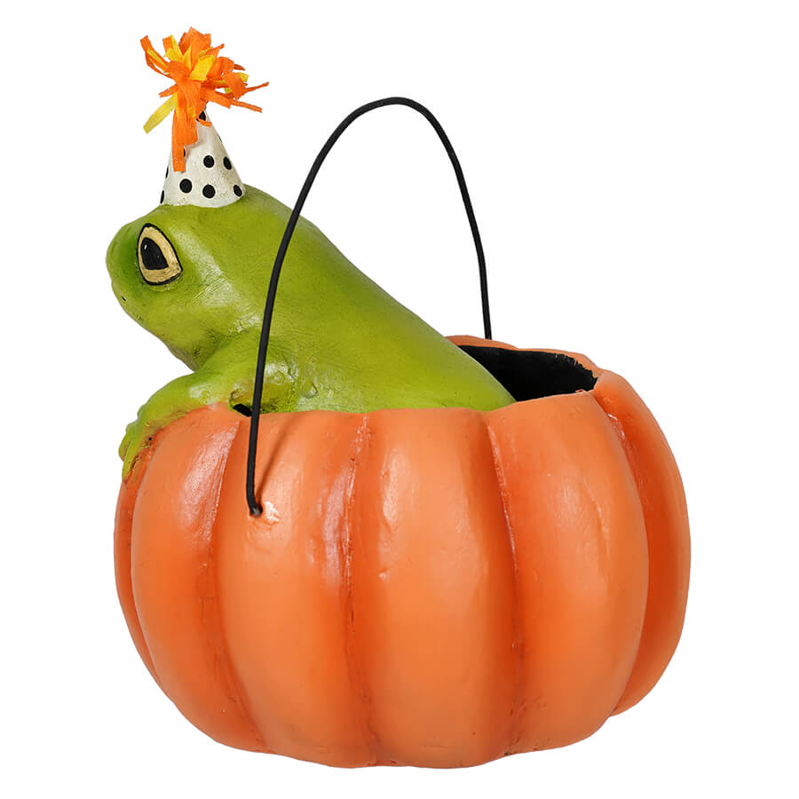 Look who is trying to sneak into your Halloween party decor, it’s a cute little frog hiding in a small pumpkin bucket! The Party Frog in Pumpkin Ornament features a frog in an adorable polka dot party hat, topped with an orange crepe paper pom pom. Peeking out from inside of a tiny pumpkin bucket with Trick or Treat written on the side in black, makes it a fun addition to a tree full of Halloween buckets and other party themed ornaments! If you are looking for a cuter aesthetic for your Halloween party decor, the Party Frog in Pumpkin is sure to make a splash with your décor and add some whimsical fun to your tree. Especially among a group of Halloween party critters!