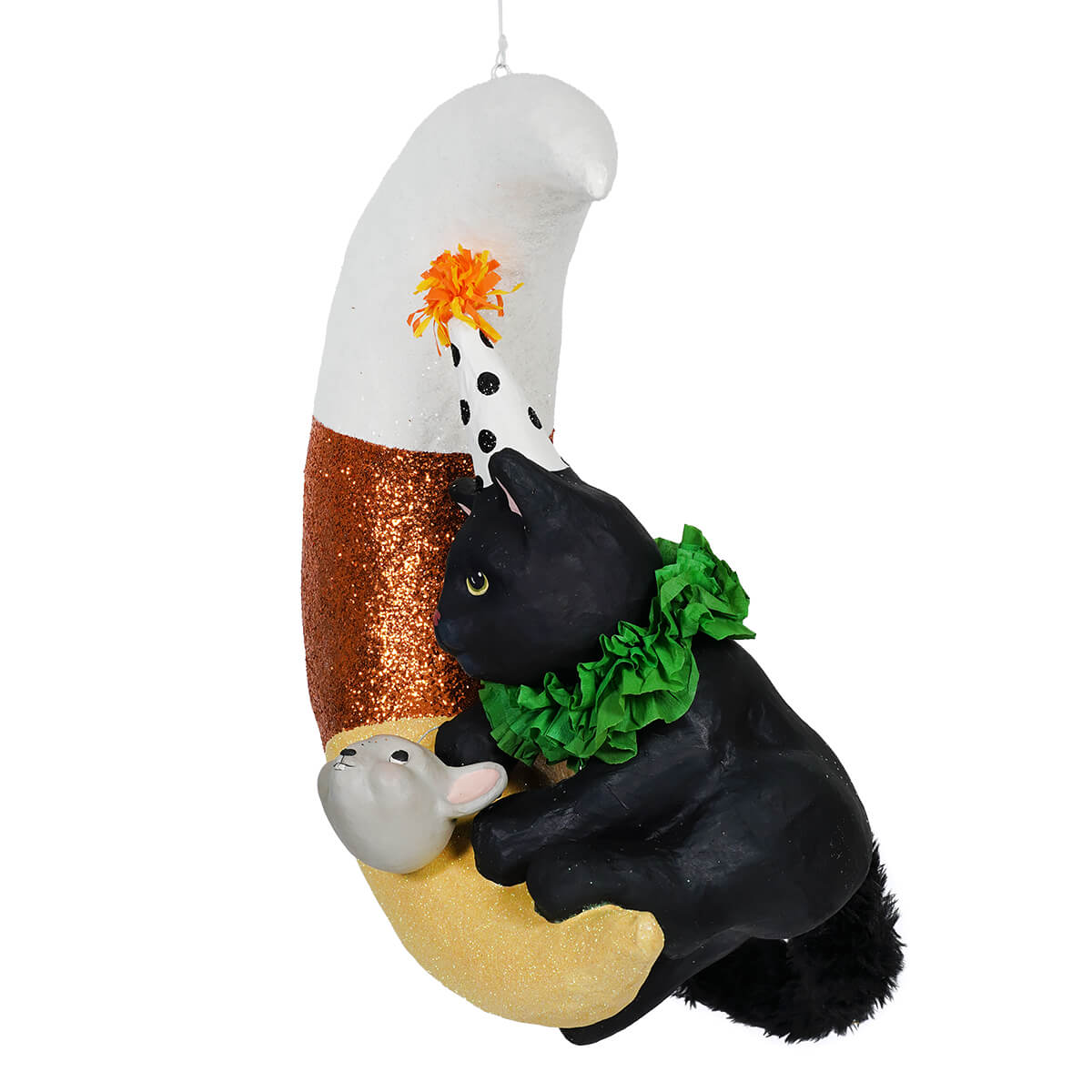 Hang this Halloween Party Kitty On Candy Corn Moon where everyone will see it, since it is cute and fun without being too spooky. Party Kitty On Candy Corn Moon is the perfect addition to any Halloween gathering or celebration. This playful party animal is a fantastic addition to your home or office décor and is sure to spread some festive Halloween cheer this season. Just under 16 inches tall the sweet faced, black Party Kitty is crafted from paper mache and rests upon a glittery candy corn-themed moon. He sports an adorable little polka dot party hat and a green crepe paper collar for extra fun style! He even has his own candy bucket shaped like a mouse head, which he likes to take everywhere with him, even when swinging from a candy corn moon!