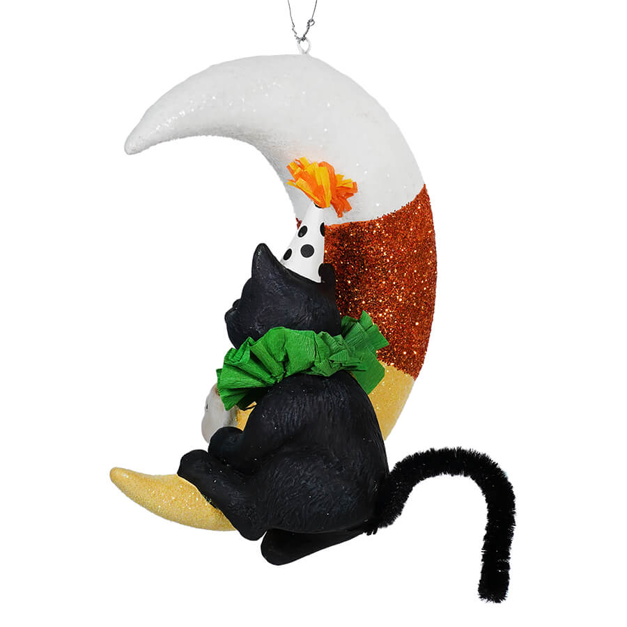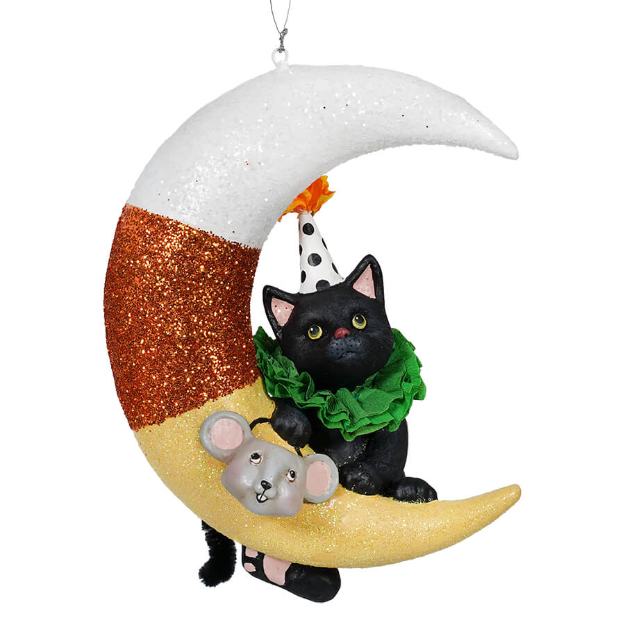 Similar to the larger Party Kitty On Candy Corn Moon hanger, this little ornament is a fun decoration that will be a great addition to your Halloween feather tree. He is made of paper mache and sits on a moon decorated like a glittery piece of candy corn. He wears a cute polka dot party hat and a green crepe paper collar for added style. He even has his own candy bucket shaped like a mouse head, which he likes to take everywhere with him, even when swinging from a candy corn moon! This Party Kitty On Candy Corn Moon decoration is both cute and fun, making it a great choice for adding a festive touch to your Halloween themed tree.