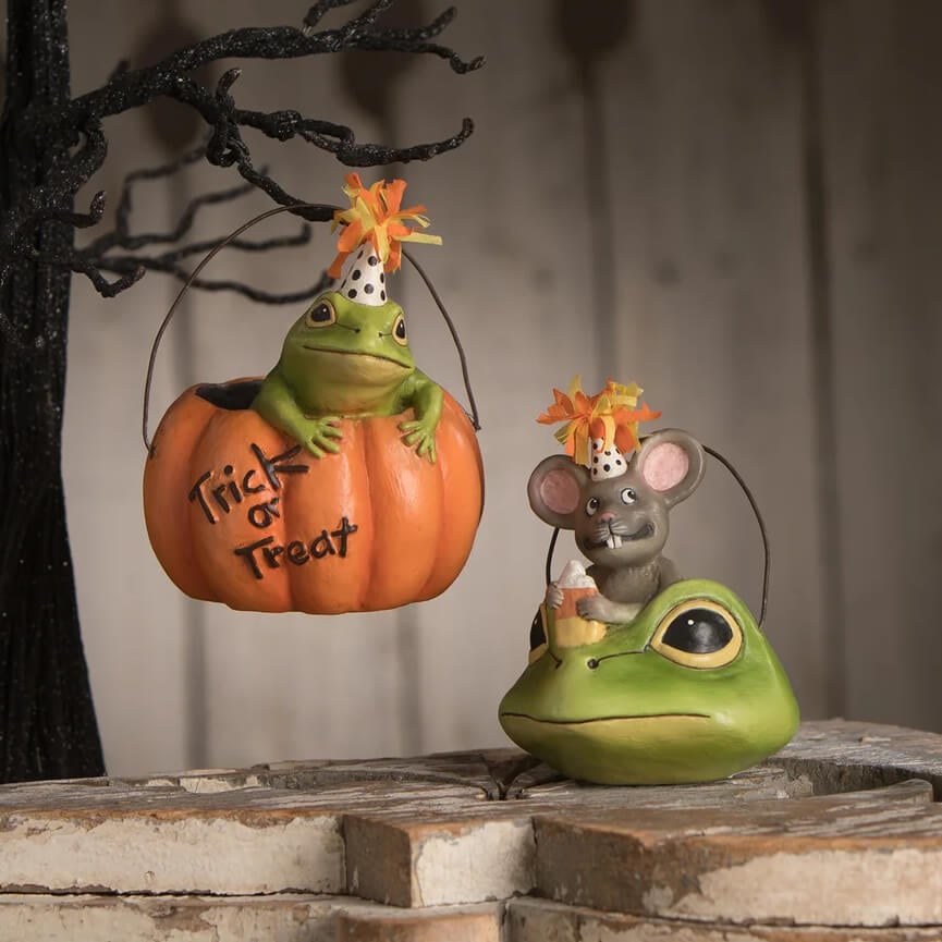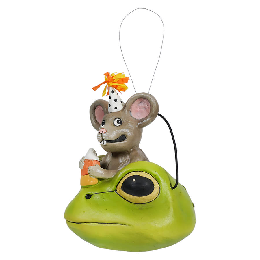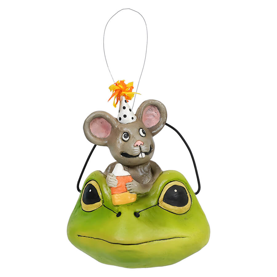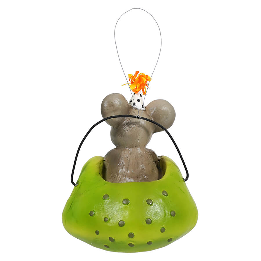 It looks like an adorable little party crasher is out stealing candy corn this Halloween! The Party Mouse in Frog Ornament is a charming addition to a Halloween tree full of Halloween buckets and other party themed ornaments. Peeking out from a frog head shaped candy bucket this little mouse is wearing a polka dotted party hat topped with an orange pom pom made of crepe paper. Of course he is nibbling on a piece of candy corn. This piece is whimsical and fun and sure to add some personality to your Halloween decor. For folks who prefer a cuter aesthetic in their Halloween party decor, the Party Mouse in Frog Ornament is just the thing for you!