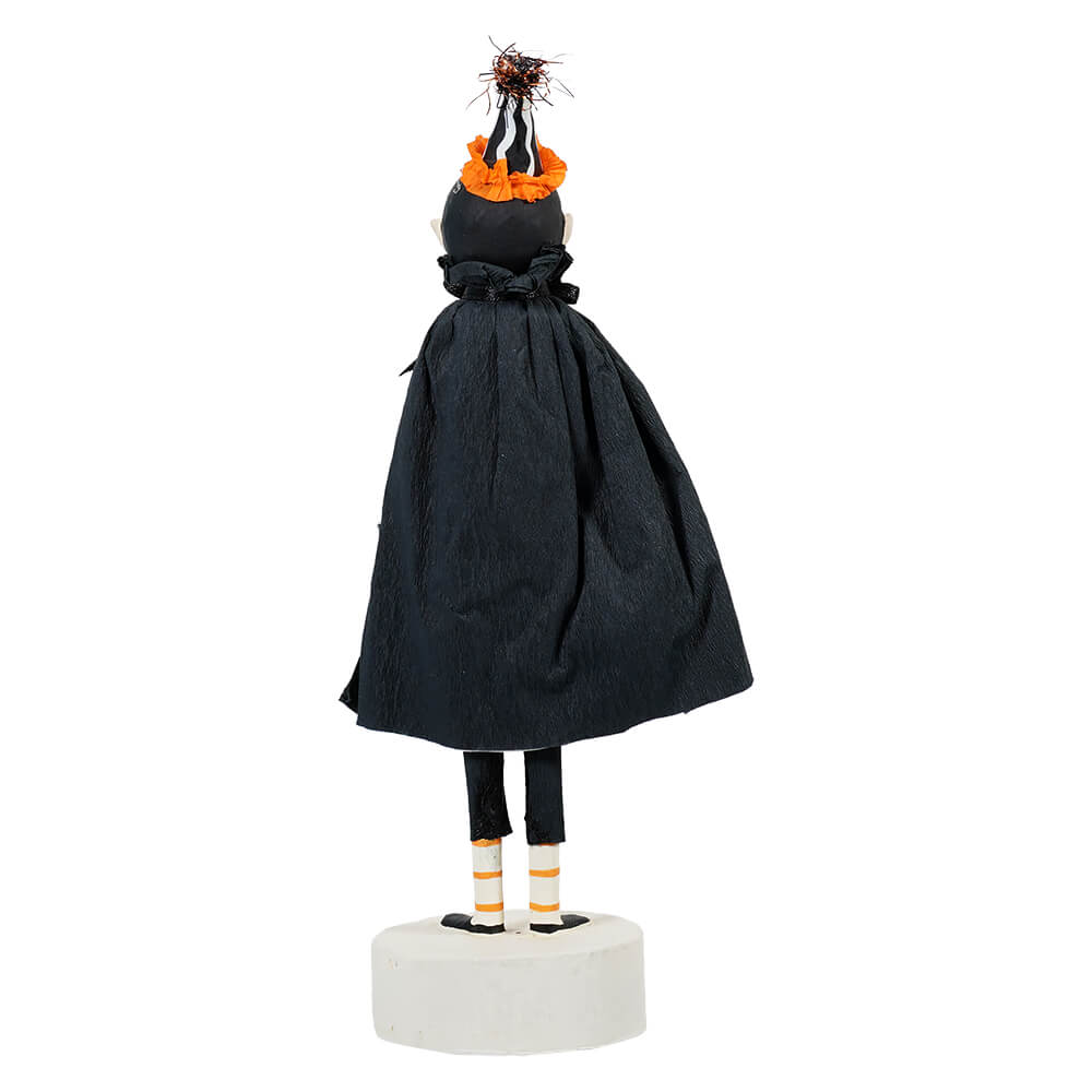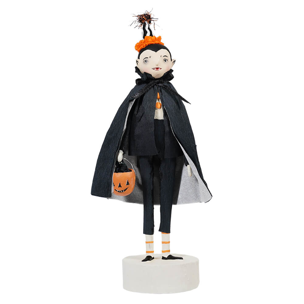 You will probably never hear the words, vampires are famous for coming out of the Party Time Dracula Boy, but we couldn't help hearing, "I VANT to suck your blood" when we saw this figiure! Those tiny little fangs, black slicked hair with widow's peak and pointy ears just scream Vampire! So, if you don't want to trek to Dracula's Transylvanian castle this Halloween, bring a little bit of Vlad the Impalwer to your Halloween deocr. The Party Time Dracula Boy, with his classic getup, black gothic cape made from crepe paper, is sure to boldly stand out from the crowd. He is dressed for an elegant and dark evening fit for a vampire duke, complete with that bold cape that’s perfect for staying warm trick or treating on a cold Halloween night. With Party Time Dracula, you can embrace the Halloween mystique as well as the festive party celebrations. And along with his friends Ghostie Girl with Candelabra and Trick or Treat Spider Girl for the perfect festive trio of trick or treaters!