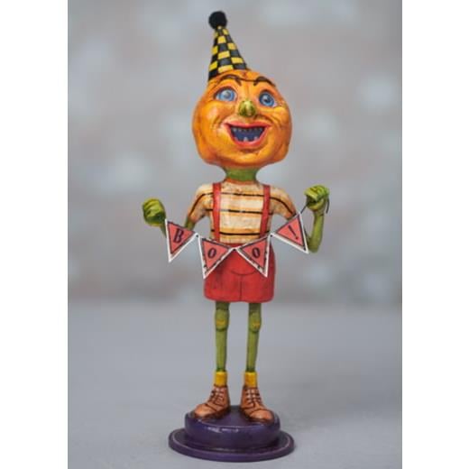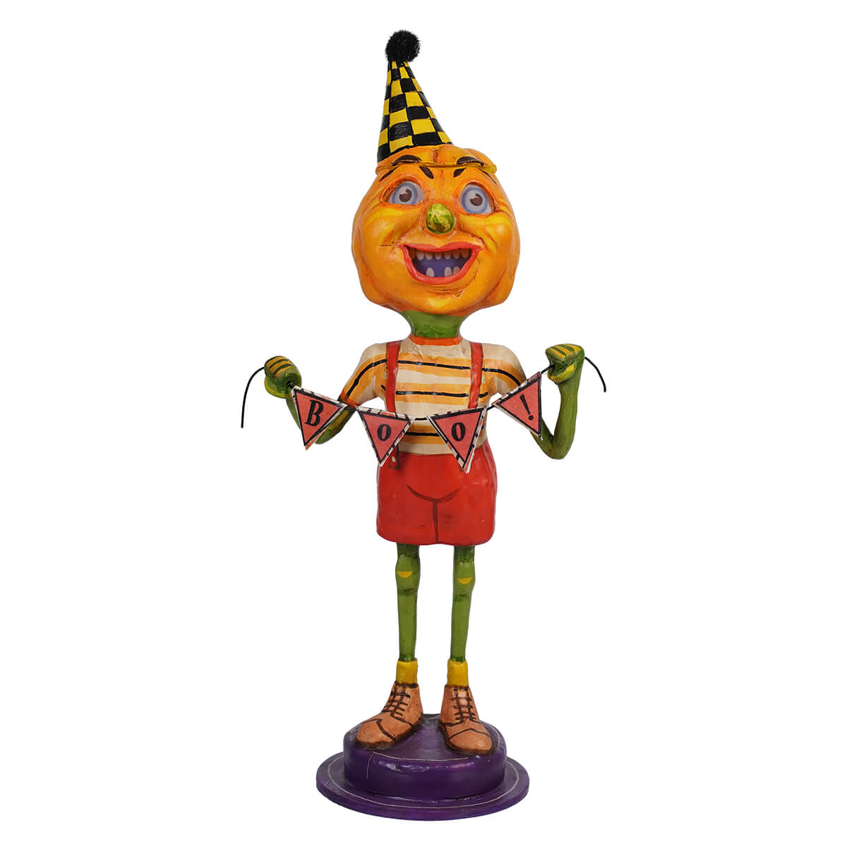 With his pumpkin head and vibrant green vine limbs, Pasquale stands tall at 10 inches. Dressed in a playful stripey shirt and cheerful red overalls, he holds a garland that proudly spells ""BOO!"" But it doesn't end there – open the compartment on his head and insert an electric tea light to watch his eyes and mouth come to life with a warm, glowing ambiance.
