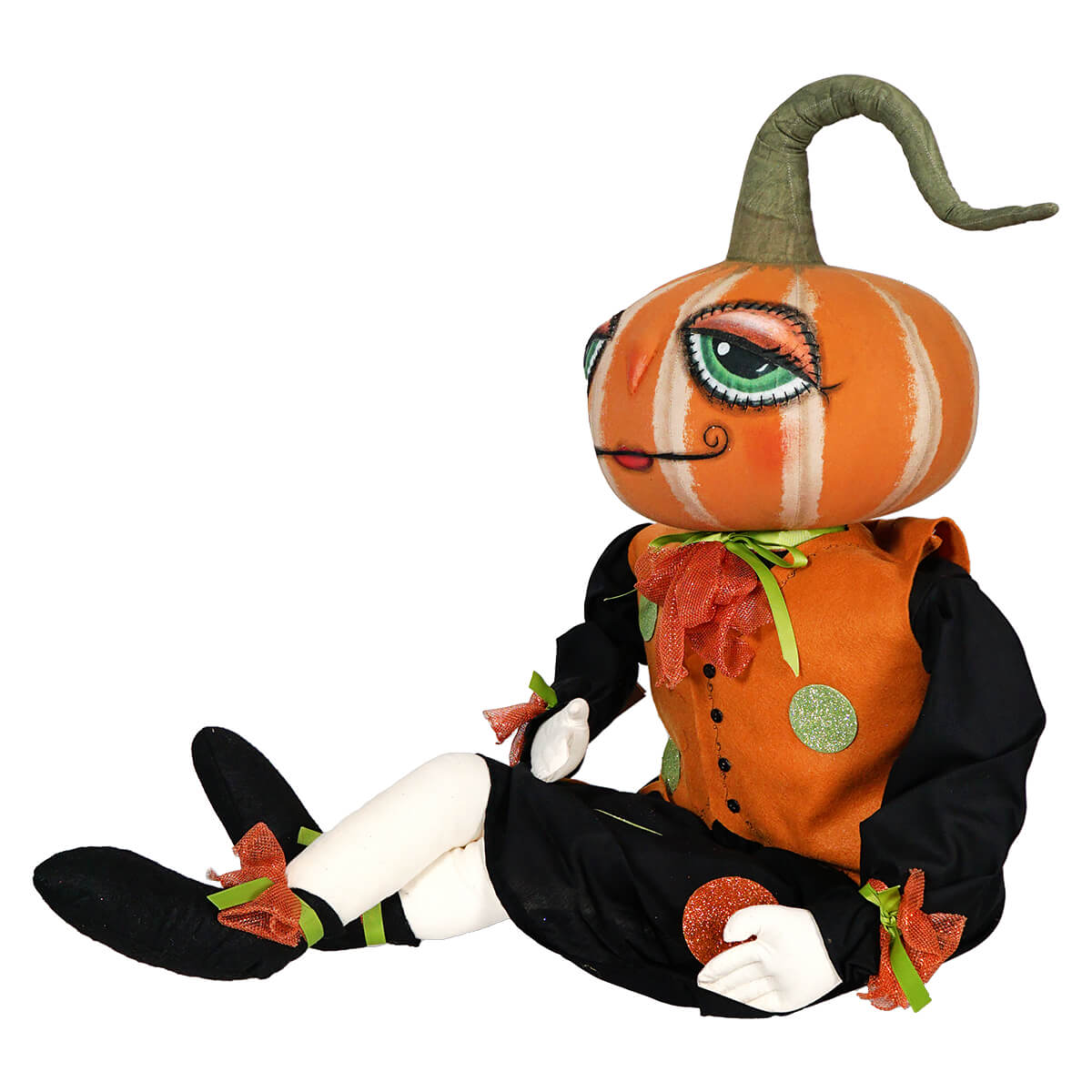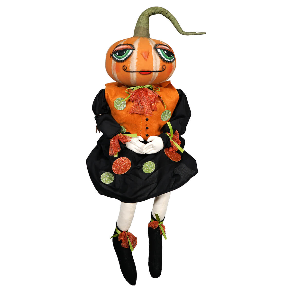 This gourd-headed cutie is an ideal companion for the devilish Pablo Figure, both crafted by the artful Joe Spencer. Dressed to impress, Petra stands at a proud 42 inches in her velvety black dress with glittered orange and green polka dots. Petra has a pumpkin head with sleepy eyes and a slightly smug lazy smile. Guaranteed to add a touch of mischief to any home décor, the Petra Figure is the perfect addition to any spooky season! Petra will be sure to receive compliments from all of your Halloween guests, adding the dramatic flare, especially combined with the unique style of her partner!