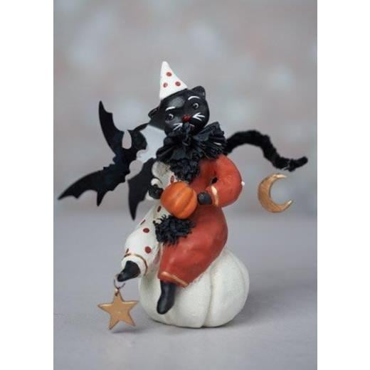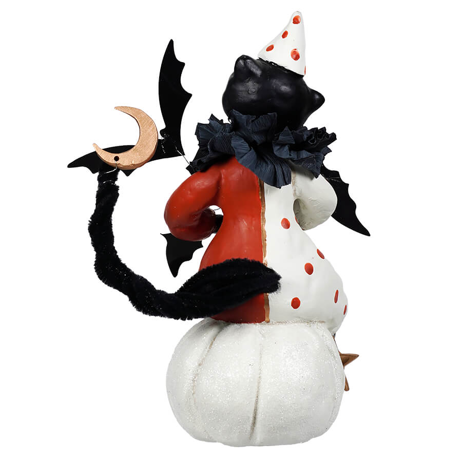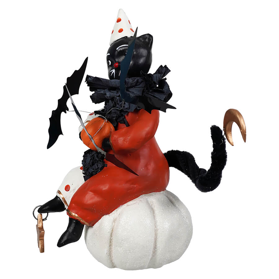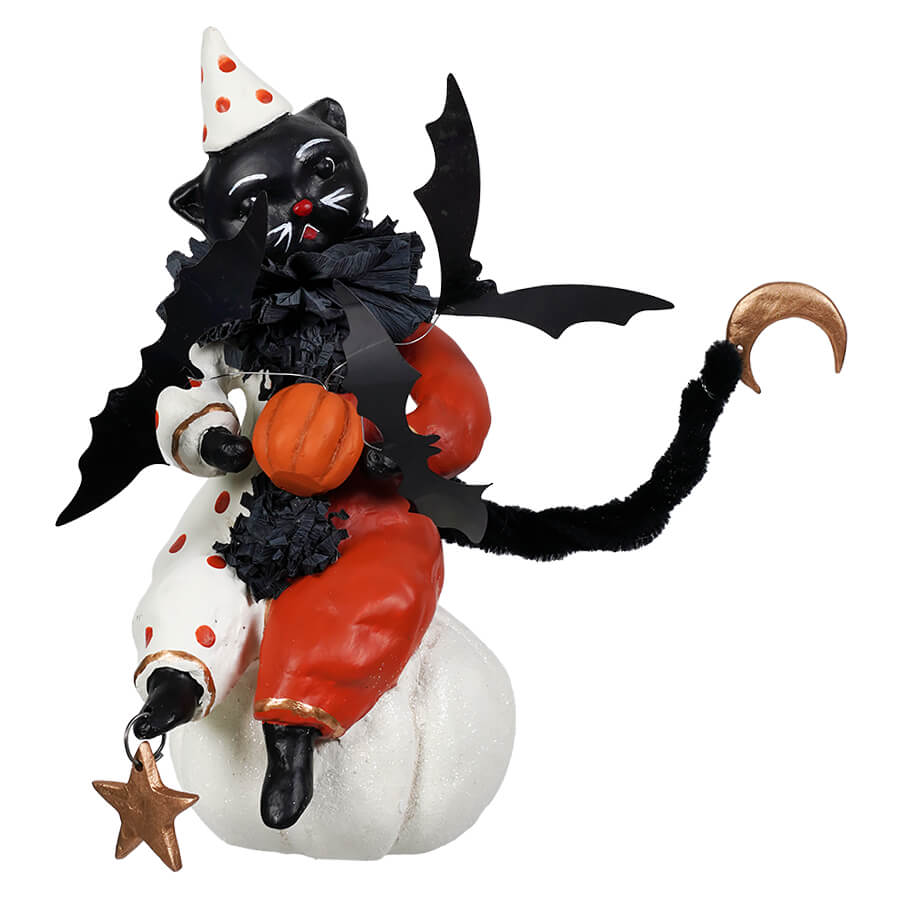 Pocus, the enchanting feline, captures the essence of mystique and merriment in a captivating white and orange clown ensemble, accentuated with black crepe paper details. Perched atop a snowy pumpkin, this charismatic cat astounds spectators by conjuring bats from the depths of the gourd, much like a magician pulling rabbits from a hat.