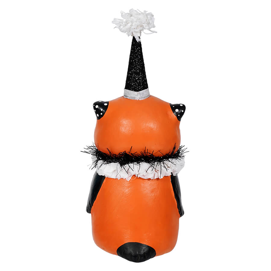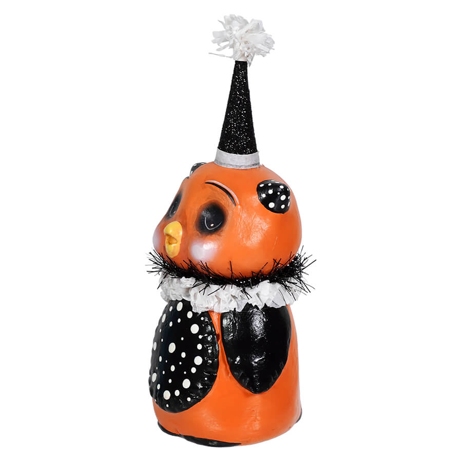 With its tall and majestic black glittered party hat, adorned with a fluffy white crepe pom-pom atop, Hootie immediately catches the eye. The hat stands tall as a beacon of celebration, beckoning all to join in the Halloween festivities. But that's not all—take a closer look, and you'll notice Hootie's meticulous attention to detail.