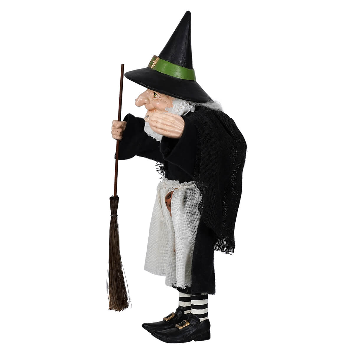 Dressed in a simple black dress with a white apron, she embodies the quintessential image of a classic witch. Her buckled shoes and iconic witch hat complete her timeless ensemble, adding a touch of nostalgic style to her character. Created with great attention to detail, this witch figure is made from a combination of hand painted resin and fabric clothing. The intricate design of her features and clothing showcases the artistry and craftsmanship behind her creation. In her hand, she holds a broom made from natural grass, and a skeleton key hangs from her hip, hinting at the mysteries she holds and still has access too, in case anyone should ask!
