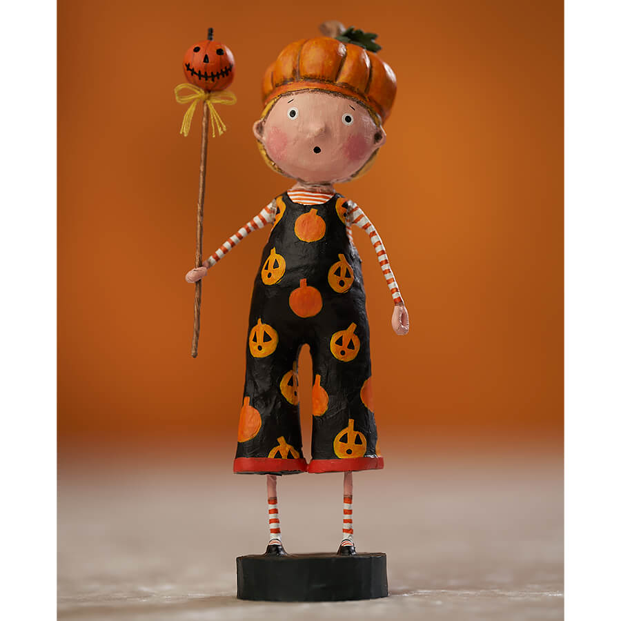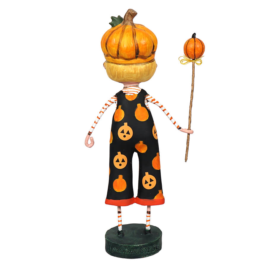 Excitedly, Tommy put on his favorite orange and white long underwear and slipped into the pumpkin face jumpsuit. But there was still something missing. That's when he discovered Pumpkin Patches, a delightful figure by Lori Mitchell for ESC and Company.