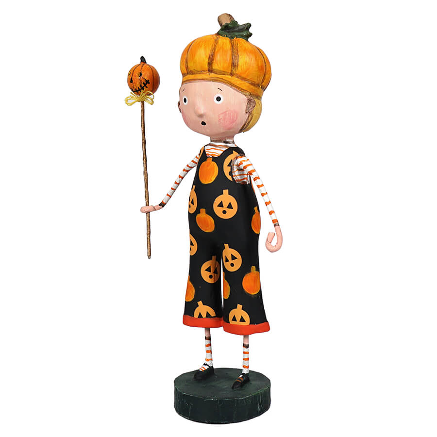This little kid is not fond of all the spooky things that are associated with Halloween, so no ghost, ghouls or warlock costumes for him! But he does love the Fall and pumpkins, as a result he convinced his mom to help him create a fun, carved pumpkin face jumpsuit, which he is wearing over his favorite orange and white long underwear! To finish the costume, Pumpkin Patches, a figure by Lori Mitchell for ESC and Company added a crowning achievement to his head gear, a hat that looks just like a hallowed out pumpkin, complete with its stem and leaf! Pumpkin Patches is really not even fond of trick or treating, so instead of a candy bucket he is carrying a jack-o-lantern on a stick, while he goes out with his friends on All Hallows Eve. There are just so many Halloween trick or treat figures from Lori Mitchell, that you could put groupings all over your home!