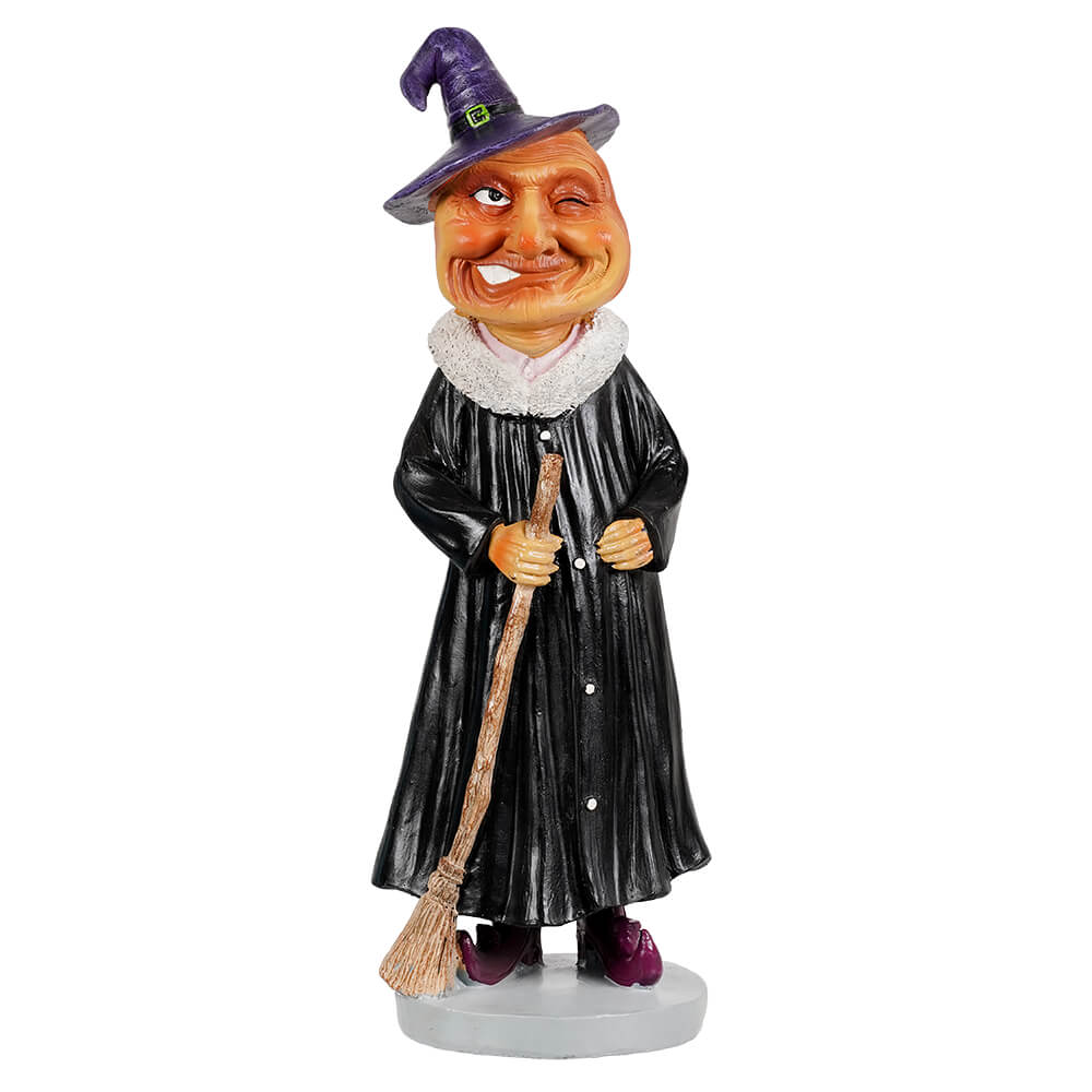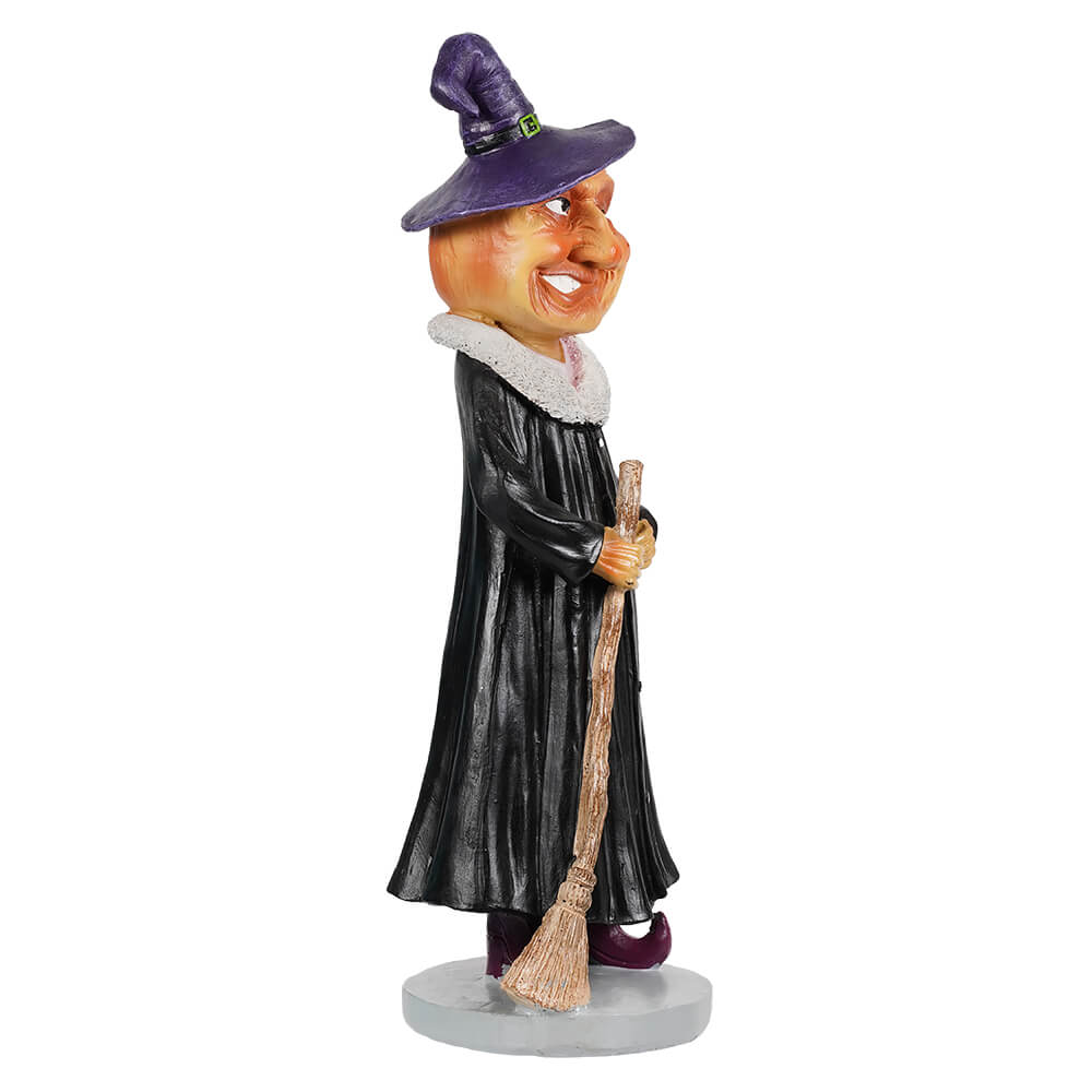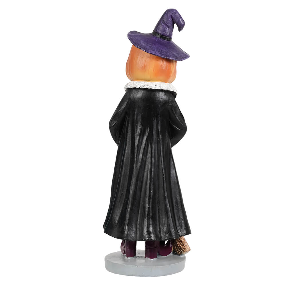 With a wink and a sideways, sly grin this Pumpkin Witch Holding Broom will set the mood for at least one of your Halloween displays! Standing at 15 and a half inches tall, this pumpkin witch is dressed in the traditional, draped black long dress, complete with a black pointed witch hat, black and red curled toed boots and of course a broomstick. She will look great standing as a center piece or with other Halloween figures to create a coven of magical proportions leading up to October 31st! Cast some spellbinding vibes this Halloween season with this positively cheery crone!