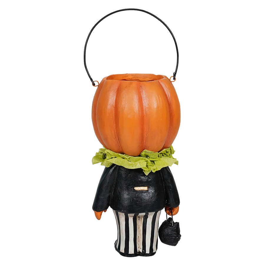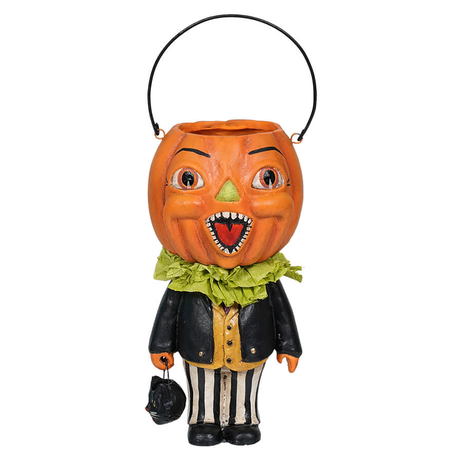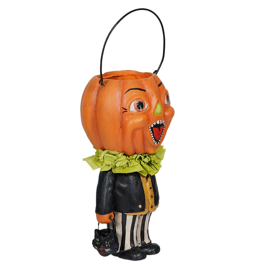 We just adore these unforgettable figural Bucket Heads! Even his name is cute: Pumpkinny Bucket Head! He's the spookiest, cutest decoration of the season that you can't help but fall in love with. With his swanky style, complete with a black jacket over a yellow vest, black and white striped pants and his cute little black cat candy bucket he looks like quite the refined gentleman. And with that green crepe paper collar his distinct style takes on an even more festive flair! He is the perfect size to hang on a black Halloween tree or a feather tree. You can also pair Pumpkinny with his mates, the Kitty Bucket Head and Skullie Bucket head and you’ll have the perfect trio of vintage style paper mache Halloween figures!