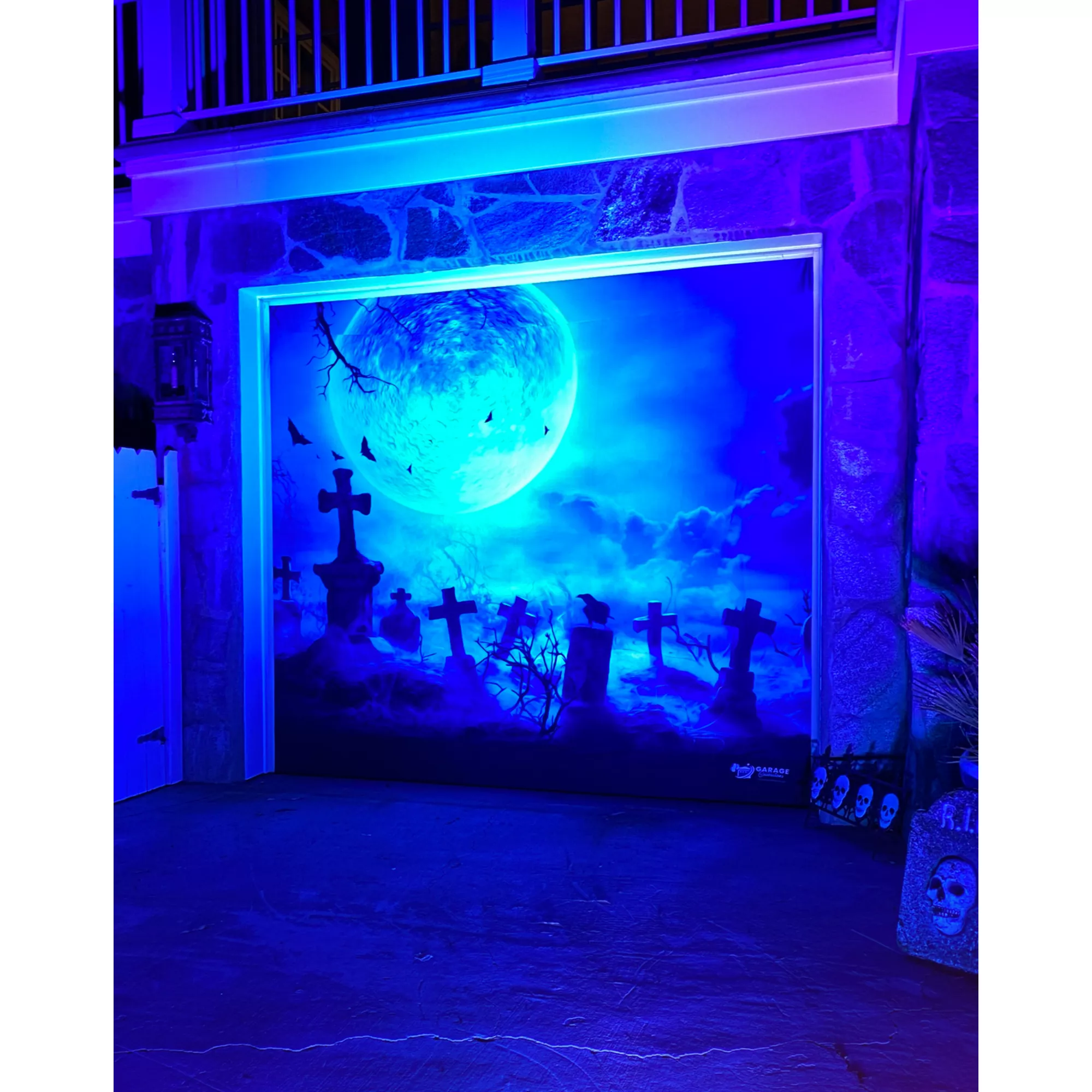 Make your 7-foot-tall by 8-foot-wide single garage door look like the ultimate spooky setting this Halloween when you decorate with this horrifying Reaper Graveyard Single Door Cover. Featuring a high-quality printed design made from a durable spandex material that's built to last, this easy to set up door cover is perfect for getting your house looking Halloween ready. This cover provides an eye-popping backdrop to your evolving outdoor displays by stretching with the opening and closing of your garage door with no wrinkles or creases. With a terrifying reaper graveyard design and secure zipper closure you'll have the entire neighborhood spooked once you put this creepy cover on display. Your garage door will remain fully functional while the door cover is attached. These covers are reusable, machine washable, and fold for easy storage for many years of use.�