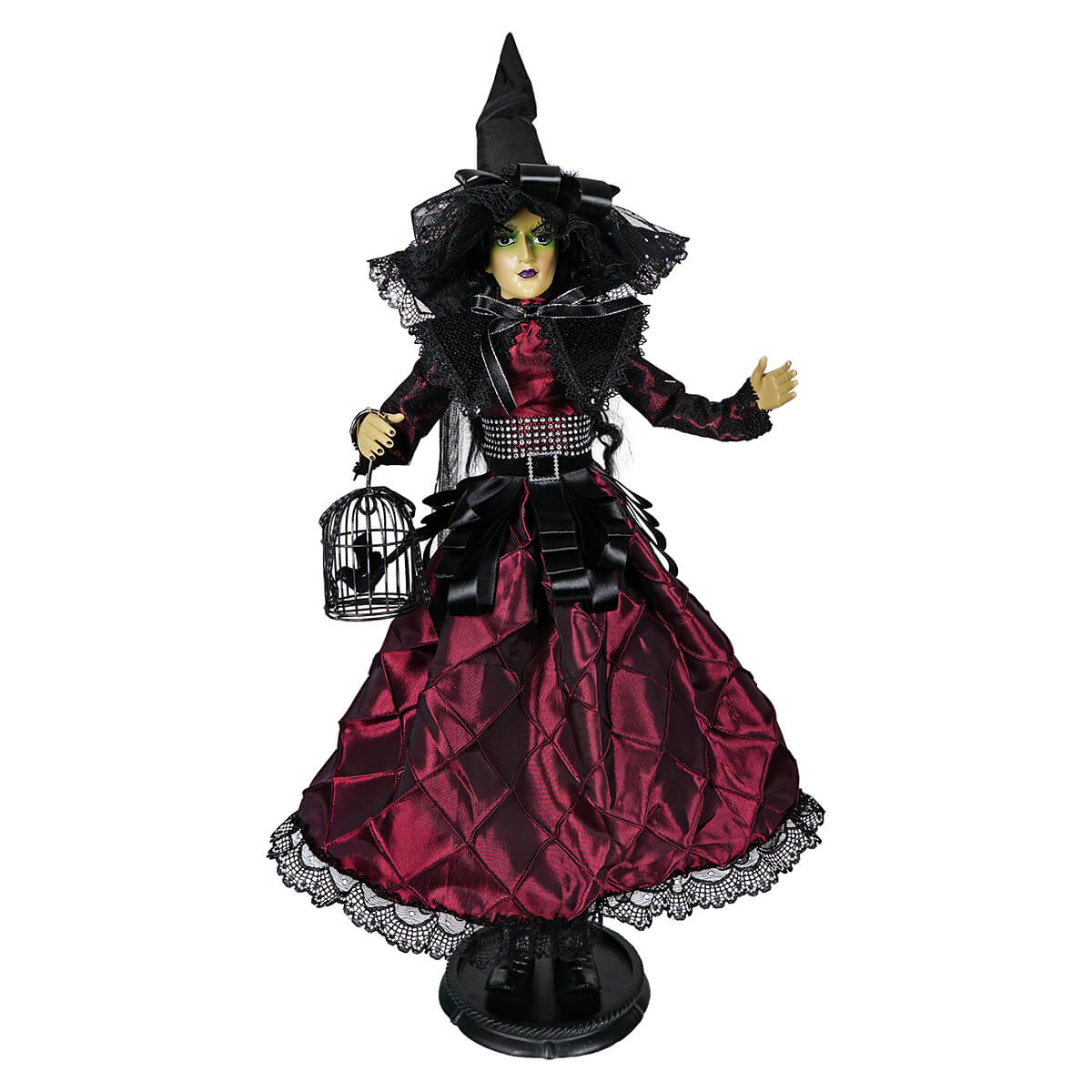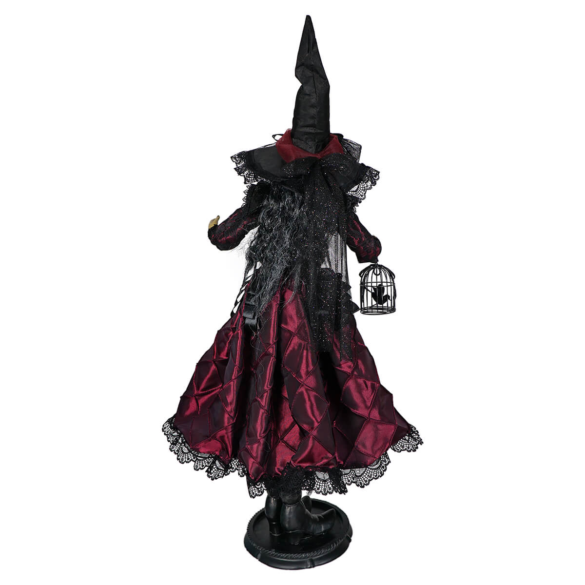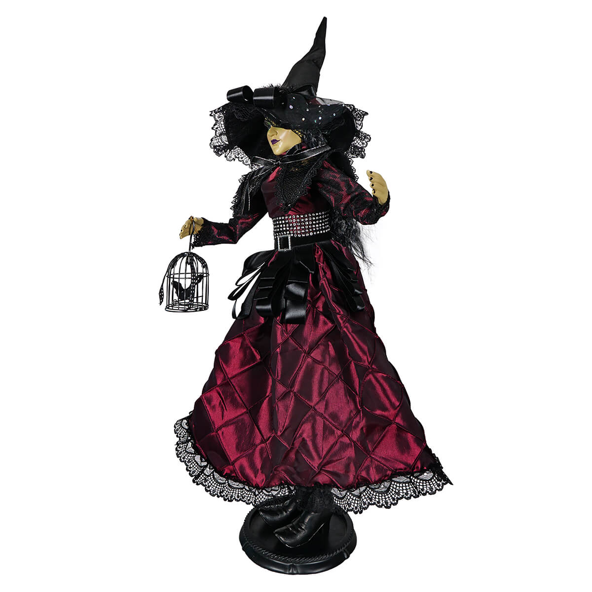 A beautiful witch figure is sometimes all you need to make a statement in a guest room or even a side table where groupings of Halloween decor occupy a sideboard. So, when we saw Samantha Witch with an Iridescent Purple Dress we knew we had found a special piece that our customers would love too! This spectacular 31-inch figure is sure to bewitch and beguile this Halloween. With an exquisite purple dress, detailed with intricate frills and ribbons, this witch is one you won't want to miss. And of course, no witch would be complete without her grand, pointy black witch hat that's been draped in fun ribbons, lace and adornments! To top it off, she's carrying a bird cage with her favorite raven, she can't go anywhere without him! Host a "Witch" night in your home, filled with potions and spells and make Samantha the centerpiece – she'll guarantee that everyone has an enchanting time!