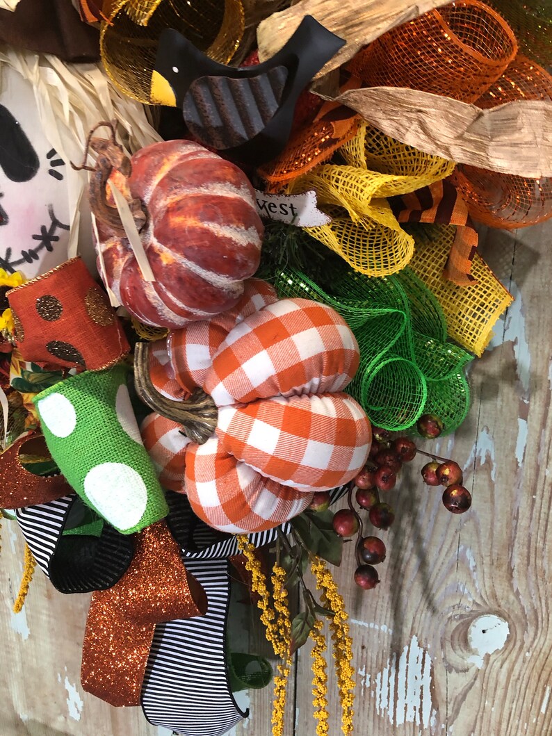 with the buttons of the scarecrow hat down to all the beautiful wired ribbon that surround this wreath