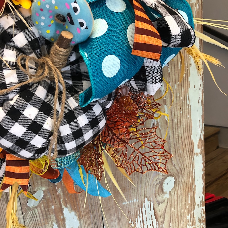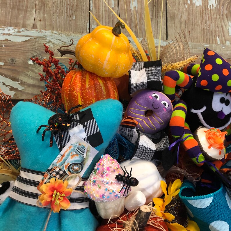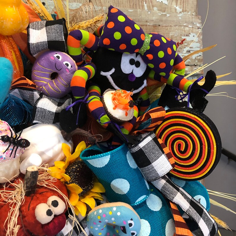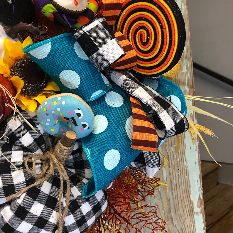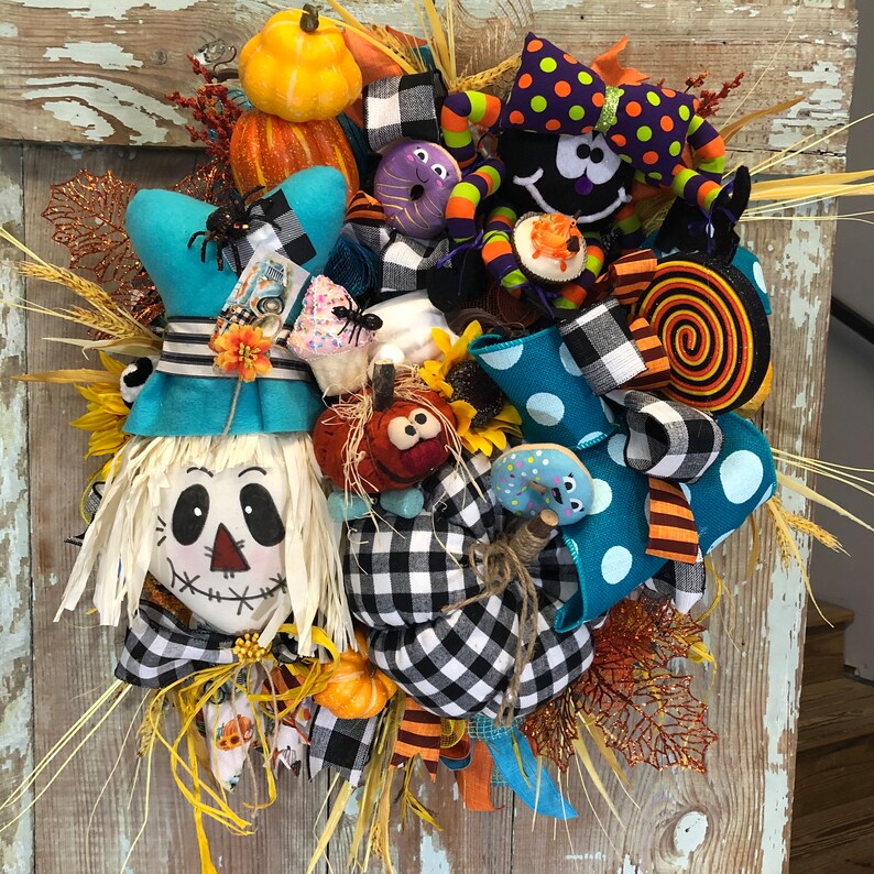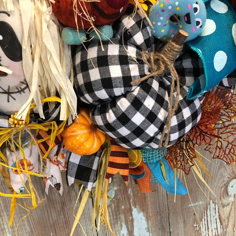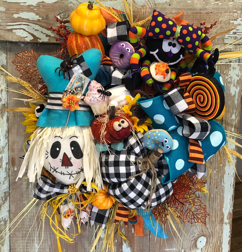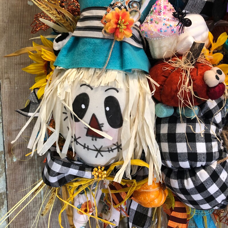 ,His little spider friend is so glad she has several hands, so she can get all that sugar. Loaded with lots of pumpkins of all kinds. Look at that cute little pumpkin sitting by this dashing Mr Scarecrdow. This wreath is loaded with design. You will find yourself going back and looking to just see the detail. Nothing was spared in this one of a kind and over the top wreath. Sunflowers and straw always make Mr Scarecrow so happy. Oh my look at the ant.