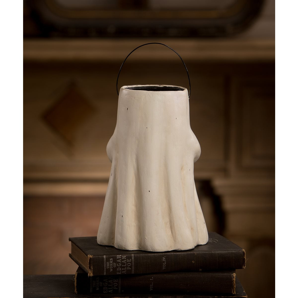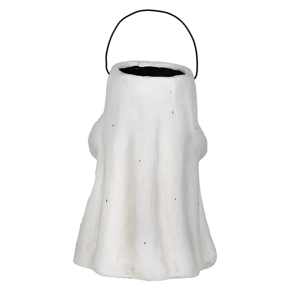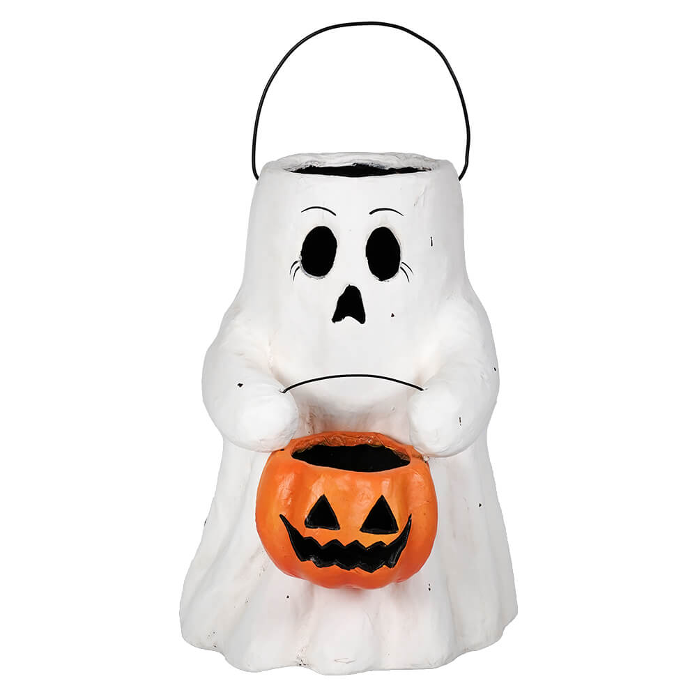 No matter where you place this ghost, it will illuminate your Halloween festivities.The charming Scaredy Boo With Pumpkin Bucket is seriously, an incredibly cute little fella guaranteed to bring a delightful presence to your Halloween decorations. This little ghost captures a vintage essence with its classic style and paper mache construction. Scaredy Boo is holding on tightly to a Jack O' Lantern bucket held snugly in its hands. The little pumpkin bucket comes to life as you place a battery-operated tea light inside, casting a warm and enchanting glow that adds an extra touch of magic to your Halloween ambiance.