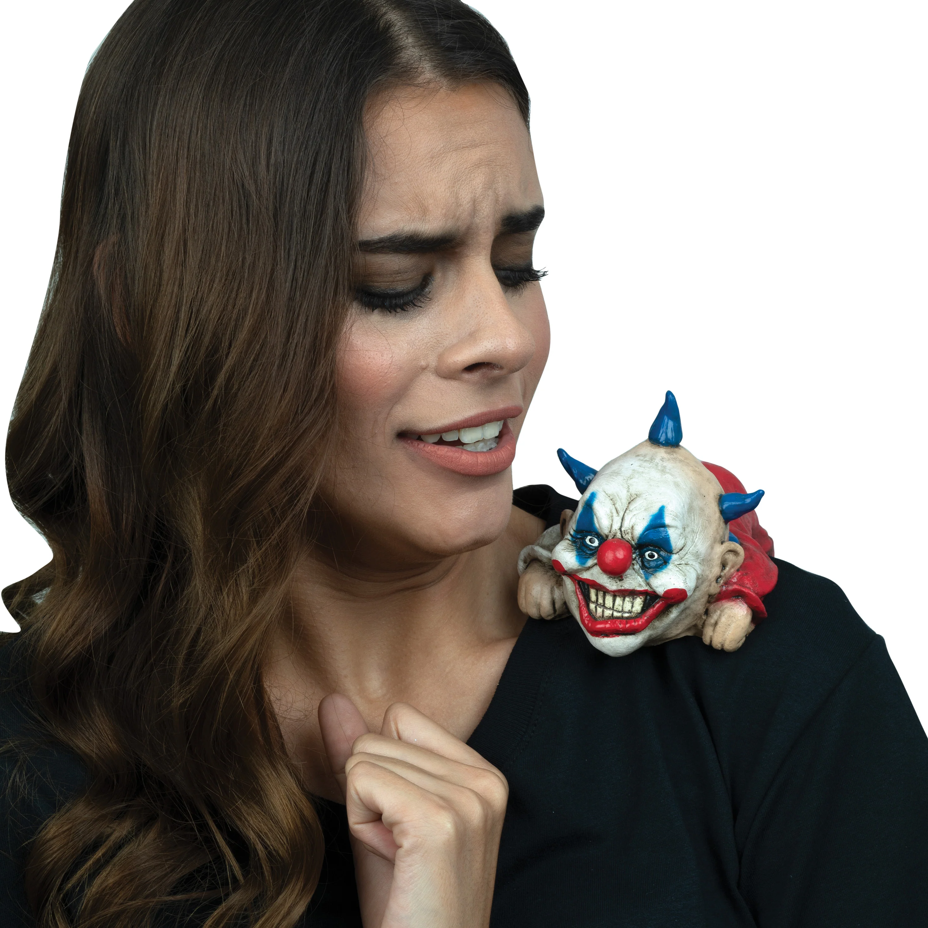 Scary clowns are a classic Halloween tradition sure to trigger feelings of fear and horror from memories of the ominous freaks at the haunted funhouse carnival ride. Simply clip the creepy clown onto your shoulder and enjoy the startled reactions of all passersby. The Scary Clown Shoulder Buddy is a great Halloween accessory and makes conversations at the office water cooler or the school cafeteria way more fun.